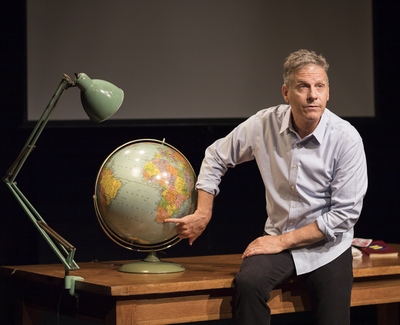 Whereas The Tricky Part trains a laser-like focus on the circumstances surrounding the trauma inflicted on him as a child, the follow-up play appears to be much more discursive and circuitous. The evening begins straightforwardly enough as Moran explains that he is dying to describe a particular dream he has had. Before he can do so, however, he has to back up and provide context for the dream. In the process he shares a number of ostensibly unrelated stories (many of which are quite funny) about family, work, volunteer service, and a trip to South Africa. He recounts, for instance, the experience of meeting his stepmother for the first time and being confronted by her at his father's funeral. He weaves an extended account of providing translation assistance for an African refugee, Siba, who is applying for political asylum status in the United States. There is also a poignant presentation of Moran's younger brother, who faced his own demons and created his own form of self-exile. The collage of stories reflects a description posited by a South African tour guide, who triggers one of Moran's rare eruptions of rage. Unable to make sense of a road map, the guide explains that because of his lack of formal education his thinking is jumbled and chaotic. He tells the frustrated narrator, "You, you people . . . your minds are organized. You see these things. I never got my mind . . . organized." It seems to be an apt representation of Moran's episodically meandering monologue. Yet, in a feat of poetic sleight-of-hand All the Rage ultimately coheres exquisitely. Throughout the play, Moran geographically locates the various stories on a globe, a map of Africa, and a New York City subway map. The stage accumulates the personal artifacts and topographical markers of Moran's anecdotes and encounters. By the end of the evening, the fragmented, expansive world of the play miraculously interconnects visually and thematically. The effect is akin to the image of Pangaea, or the prehistoric era in which all of the continents were joined together as "one earth." While a few of the references feel a bit dated (such as an allusion to Sarah Palin), the piece is especially relevant in 2019. Managing rage, supporting immigrants, and cohabitating in a fractured world, for instance, have taken on new exigency and emotional importance. I had seen the play in its original production, but I don't recall wiping away tears and being overwhelmed with sadness as I was in the current iteration. Directed by Seth Barrish (who is also the co-artistic director of the Barrow Group, which produced the show), Moran's performance is beautifully modulated. He is an exceedingly gifted storyteller, and he adroitly combines humor, pathos, and compassion as he moves through the various parts of his story. For a play about rage, there is a surprising gentleness in the delivery, and in the few moments Moran explodes with fury (sometimes for comical purposes), the impact is rattling. Except for a stunning lighting effect near the end of the play (courtesy of Russell Champa, the lighting designer), the production is refreshingly simple. (Mark Wendland is credited with the scenic design and Leon Rothenberg the sound.) The projected images are achieved by the use of an opaque projector, which was cutting-edge technology in elementary schools of the 1970s. In its simplicity All the Rage is a reminder of the power of effective storytelling. Riven by anger and distrust, individuals across continental and familial divides can find common ground when they just pause to listen to one another.
