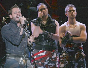 That means, among other things, lyrics that rhyme (always perfectly, as far as I could tell), relate to the characters singing them, and burst with a witty inventiveness not typically reserved for the least-respected genre of musical theatre. Of course, avid followers of the Off-Off-Broadway scene have come to expect this of this of this show's authors, Peter Mills and Cara Reichel, who've spent the last several years writing musicals in the traditional musical-comedy idiom. They are, however, at least as adept at transforming theatre into a rock concert - and making a rock retelling of a classic play both newly alive and not at all incongruous. In retrospect, it makes perfect sense: Whether examining F. Scott Fitzgerald's romance with Ginevra King through the lens of the Princeton Triangle Club drag shows in The Pursuit of Persephone, or refashioning The Producers for the Communist era with Iron Curtain, one of the duo's favorite topics has been the convoluted connections (and blurred barriers) between show business and real life. So what better way to reconceive The Bacchae, Euripides's 2400-year-old tragedy about the dangers of groupthink and sexual abandon, than by setting it against and within its contemporary cult-of-personality equivalent?