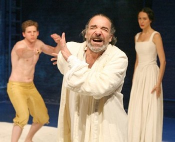 Yes, William Shakespeare wrote a play with the same title, and the people frolicking about CSC's sand-strewn, blue-box stage (designed by Jian Jung) call each other by the names of its characters. But they're not pawns in a magical, metaphysical romp being controlled by the duke-turned-sorcerer Prospero, but rather paper finger puppets being waggled by the mustard-smeared man behind the counter. Who, it must be noted, looks a lot like Mandy Patinkin, and is doing everything he can to ensure that his world is the only one worth watching. It takes only until the second scene for reality to sink in: This isn't one of those waking dreams Prospero himself might weave, it's actually happening. Brian Kulick's production looks like one that evolved outward from its star, but realized too late that the star thought his personality was supposed to be the show. So you get an inordinate amount of Patinkin, and very little anything else. Okay, that's not exactly true. You get, in varying doses, injections of the pungent anarchic spirit of Che Guevara from Evita; pensive inward stares a la Georges Seurat from Sunday in the Park With George; and bursts of I've-got-a-secret battle-readiness right out of Inigo Montoya's playbook from the film The Princess Bride. And, oh yes, torrents of Al Jolson jazz hands of the kind that vaudevillian monster Burrs wielded like weapons in The Wild Party, married with hyper-nasal, cheek-slinging speech patterns eerily evocative of Jimmy Durante - the only one of these roles Patinkin, to my knowledge, has not played. What you don't get is what The Tempest generally needs most: glimpses into Prospero's tortured and torturing soul. One can easily understand how Patinkin's penchant for illuminating sensitive corners of the minds of men with cloudy minds and often foggier morals might make him appear, on paper, an ideal Prospero. He'd convince not only as a loving father to the young girl Miranda, with whom he's been stranded on an island for 12 years, but as a man of disciplined unpredictability and unquenchable rashness, capable of both angering his brother Antonio and the King of Naples enough to compel them to depose him as Duke of Milan and to shipwreck them within his dominion as the first step toward his later retribution. This best-case scenario has not come to pass. Patinkin's Prospero regards Miranda (Elizabeth Waterston) with the same thinly veiled contempt he does Antonio (Karl Kenzler), the King (Michael Potts), and the conspirator Sebastian (Craig Baldwin) who comes between them. When Miranda is in danger of being whisked away by the hunky prince Ferdinand (Stark Sands), Prospero's eyes have long been shadowed over with indifference - he long ago saw he would lose her, and is now only behaving in accordance with that prophecy. Prospero's spirit ally Ariel (Angel Desai) and his twisted servant Caliban (Nyambi Nyambi) are likewise tools to be used and discarded as necessary. The best Prosperos define themselves as much by their relationships with these underlings as they do by their approaches to his more vividly dramatic speeches; here, they're uncommonly athletic and unaccountably tattooed furniture, rather than objective correlatives of Prospero's feverish revenge inclinations. To their credit, Kulick and Patinkin touch upon the intriguing idea that Prospero's only problem is treating everyone exactly the same. This gives an unusual resonance to his climactic speech about abjuring his powers before resuming his nobleman's life: He's lived on the other side of the throne long enough to see that, rich or poor, everyone is equally easy to corrupt or save. Unfortunately, this robs the play of its characteristic warmth early on, and utterly decimates its catharsis later: Someone who's already attained such an enlightened state doesn't need to learn that magic alone can't solve every problem. Prospero, then, is reduced to little more than game playing, which is somewhat less satisfying from him than it is from the King's jester Trinculo (Tony Torn) and besotted butler Stefano (Steven Rattazzi) as they wander about with Caliban in the play's low-comedy quarters. This trio's excitably arch approach would probably not jibe with the stately surroundings in a regular production, but here, they set the tone: ineffective, but of a piece, outside of Patinkin. Waterston's performance is suitably wide-eyed, but bereft of innocence - you don't quite believe her when she claims she's never seen other men before. Nor is it clear what attracts her to her especially bewildered paramour; Sands, playing a stereotypical empty-headed royal, was put to much better use as a boy growing up behind the barrel of a gun in last year's revival of Journey's End. Sands, however, at least demonstrates an adaptability, a willingness to reinvent himself. While Patinkin is often at his most powerful when melding coy sweetness with festering darkness, his only balancing act here is between his marquee name and the expectations of the audience. This has, indeed, inspired a Prospero, and a Tempest, we've never seen before. But since Patinkin has done so by presenting himself only as he's previously appeared, the results are closer to insult than insight.