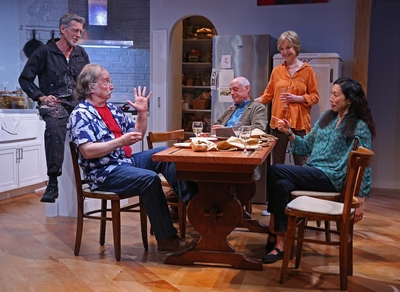 The play's title is a reference to the non-working farm in upstate New York that is a get-away property owned by one of the couples, Sunny (Jill Eikenberry) and Jer (Mark Blum); the punning reference to another familiar duo is undoubtedly intentional, but it is never touched upon. Their very good friends, Billy (Mark Linn-Baker) and Michiko (Jodi Long), and Darla (Ellen Parker) and Vincent (John Glover), are their frequent weekend guests. The reason for this particular get-together ostensibly is a group celebration of milestone birthdays for the men. Billy is turning 60; Jer, 70; and Vincent, 80. But the gathering also has another purpose. After the toasts and the friendly banter among the long-time friends, it comes to light that, among the women at least, there has been some serious discussion about having them all live together, communally. This way, they can not only be surrounded by their nearest and dearest, but they can help each other get through the vicissitudes of growing old instead of leaving it up to offspring or hired caregivers or institutional settings. This set-up potentially is the play's stronger plot point. At its best, it might lead to something like an older person's version of Michael Weller's Moonchildren, which was about a group of college students living together in off-campus housing in the 1960s. Or maybe like the movie, "The Big Chill," or perhaps the tv sitcom "The Golden Girls." But, sadly, instead of running with it, Mr. Tucker brings in a different scenario altogether, when one of the three couples is revealed to be having problems in their relationship. And even that turn of events is dealt with fairly superficially as the other two couples become surrogate marriage counselors. The play as a whole gets off to a very slow start with the exposition-heavy first act and Nadia Tass's sluggish direction. There are certainly moments, especially in Act II, when the cast members do or say something that is funny or touching. Mark Linn-Baker is particularly good at portraying Billy, an often stoned, aging hippy-dippy member of a touring rock band, a man with a big loving heart and zero impulse control. And John Glover, who always seems able to breathe life into every role he plays, manages nicely as the underwritten Vincent, the group's elder statesman, hobbled and in need of some TLC following hip replacement surgery. Jill Eikenberry, who is married to the playwright, and the two other women do what they can with their own sketchy roles, while Mark Blum as Jer, who is at the center of the group's intervention, has little to do beyond acting curmudgeonly. All six characters are given interesting backgrounds in academia or the creative arts, but they might as well be stockbrokers or airline pilots or anything else you can think of, since little is done to bring out their purported aptitudes. Unfortunately, nothing is sufficiently developed, so that what we wind up with is six decidedly talented cast members in search of a far more robust plot.