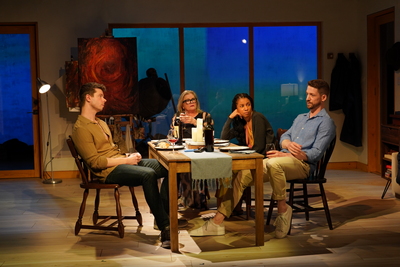 On Colm McNally's attractive set (he also did the lovely lighting, subtly suggesting changes of day) depicting Beiv's airy, modern seaside cottage and studio, Colm, on his first visit in many years, has brought a surprise: a bride, Bonnie (Ayana Workman). She's Californian, enthusiastic, eager to please, and a decade or so his junior. She's bubbly and positive and seems destined to live out her days as a dear little wifey, though she's also studying Jungian psychology. In short, she's unformed. This doesn't sit well with Beiv, who's of the firm opinion that "No one in their right mind should get married before 30." But then, Beiv's of a lot of firm opinions, and a lot of things don't sit well with her. Mulgrew, trudging warily across the stage and wringing laughs out of lines that might challenge most other actors, presents a tough old bird who decided her career constituted most of her life, and isn't apologizing to anybody for it. Harris metes out Beiv's history in dribs and drabs, and her exposition can be on the club-footed side. We quickly get this much: Beiv's late ex-husband vanished in a boating accident under mysterious circumstances that left her something of a suspect, though she's always maintained that he was, if nothing else, "my very best friend." The intrigue over his death hasn't disappeared, though, and somebody's even doing a podcast about it. Plus, Beiv's sexuality has proved quite malleable: Sometime around her husband's demise, she founded a women's colony, and evidently diddled quite a few of them. Colm's sexuality isn't as clear-cut as it first appears, either. He had a long-ago but fervent dalliance with Donal (Sean Bell), a local who's been assisting Beiv's gut reno, and who never got over Colm. Compared with the other characters, Donal seems levelheaded and reasonable, and Bell plays him very well, a mixture of get-on-with-it practicality and long-repressed lust. There's one other character: Ray (David Mattar Merten), the podcaster, who's described as being from South Dublin but whose accent suggests it might just as easily be South Bronx, and whose impact on the proceedings is so incidental, you wonder why Harris bothered with him. Last season, in Mother Play, Jessica Lange had an eight-minute solo scene where she said nothing and revealed everything, a silent woman-adrift ballet where each gesture, each movement, meant something. It was riveting. Here, Mulgrew has a five-minute setting-the-table solo (Beiv has invited Colm, Bonnie, and Donal to dinner, to try to ease some of the distemper among them), and it's excruciating. On with the tablecloth, exit to kitchen. On with the cutlery, exit to kitchen. Et cetera. It tells us nothing; why is it here, and why has director Marc Atkinson Borrull drawn it out so? But it does set the table, so to speak, for an Act 1 curtain, as Colm, who's been rather a jerk the whole time anyway, gets drunk over dinner and tears into Bonnie for no good reason, and it wouldn't have hurt Harris to supply a good reason. But it does set the stage for a second act that emerges as a series of confrontations: Colm and Donal, Bonne and Donal, Beiv and Colm (one moment we've seen coming all along: She reaches out to comfort him, he quickly pulls away). Some good scene writing here, and some good playing–though to these eyes, Mulgrew and Appelman both rather overplay their final joust, and I'm not sure I'm buying either Beiv's or Colm's big speeches. But Harris has a bad habit of having her dramatis personae make subtext-free, front-and-center declarations: Donal's "I ruined my fucking life for you, Colm," or Colm's "You have always loved your art far more than you've ever loved me," to Beiv, natch. Threads are left hanging, and much as we want to believe everyone has learned something about himself, there's a curious stasis; Beiv will remain career-focused, Colm will still be a jerk, and Donal, the most appealing of this not-very-appealing bunch, well, we hope Donal will move on. There is a beacon, by the way, a big hilltop monument on the island that reminds Bonnie of a vibrator. But its lack of symbolic value leads one to suspect that Harris was just stuck for a title. Harris seems to want to say something about the need to shut oneself off from the rest of the world in order to create (really?), and the effects of that isolation, and culture clash, as in: