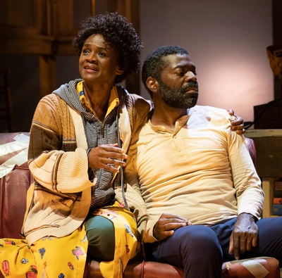 Set in 2012 in their Worcester, Massachusetts family home, runboyrun is a harrowing study of Abasiama's second husband, Disciple Ufot (Chiké Johnson), and his traumatic childhood as a survivor of the civil war (1967-1970) that erupted when Biafra declared independence from Nigeria. Directed by Loretta Greco, the play is filled with flashbacks to 1968 when Disciple was a Boy (Karl Green), where we meet his mother (Zenzi Williams), his sister (Adrianna Mitchell) and his brother (Adesola Osakalumi), all of whom are barely surviving in warn-torn Biafra. The Worcester house, a character itself in both plays, haunts Disciple with doors opening and closing on their own, as well as the flashbacks he experiences down in the basement where he's shut himself off from Abasiama who's at her breaking point with her clearly disturbed husband, after telling him she wants a divorce. The conclusion of runboyrun finds Disciple finally revealing to Abasiama what happened to him as a child that he's carried with him for the thirty years they've been married. She's rightly furious with him for keeping this story from her and we're not sure what will happened to this fractured couple as the play concludes. Directed by Awoye Timpo and set several decades in the future in the same Worcester house, now dilapidated and falling apart, In Old Age finds Abasiama an old woman having to deal with an elderly man, Azell Abernathy (Ron Canada), who shows up on her doorstep to do repair work which has been prepaid by Abasiama's daughter, Adiaha. Of course, the last thing Abasiama wants is anyone in her house but Azell's tenacity and stubbornness rival hers and he eventually works his way into her house and, perhaps, her life. Even more so than in runboyrun, the house in In Old Age, now clearly haunted by Disciple and the ghosts of her bad life decisions, becomes a full-blooded character in the play, complete with relentless knocking sounds that become louder and louder as time progresses and Azell ingratiates himself into Abasiama's life. The conclusion finds Abasiama ridding herself of all of Disciple's belongings from the basement, which rids her of the knocking sounds, too. While more plays about the African diaspora in the United State are always welcome and encouraged, the primary problem with both of Udofia's plays is they're too long with subject matter this grim, particularly when they're performed together with one intermission. Many in the audience the night I attended left after runboyrun and this writer felt their pain. Disciple is so clearly mentally unstable it's hard to believe Abasiama would have continued to stay with him. The flashbacks have a monotonous quality to them that undercuts their effectiveness, and the conclusion when Disciple finally tells Abasiama what happened to him when he was a child, while moving, also defies credulity. Similarly, In Old Age grows oppressive with the sound of the house knocking because, again, it goes on too long and is too loud. It's a metaphor, we get it; but scene after scene of it becomes incredibly tedious. Plays shouldn't be hard to sit through, they should inspire us or thrill us or challenge us to think, but they shouldn't tax our physical endurance. The acting and production values of both runboyrun and In Old Age are excellent; there's just too much of both of them.