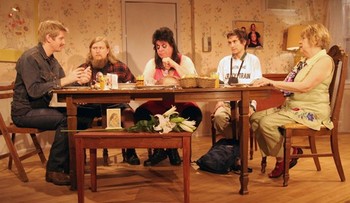 American Sligo, Rapp's latest play and appearing now under his own direction at the Rattlestick Playwrights Theater, continues this trend. This is not, for the record, surprising, though it is saddening: Those who have followed this playwright's burgeoning career in recent years are aware that when Rapp turns his critical faculties away from a broader pop-culture society and toward the struggling individual, he's capable of producing compelling, emotionally relevant works. His Blackbird (not to be confused with David Harrower's play of the same name that played at Manhattan Theatre Club last season) is a haunting and beautiful expression of love between disintegrating souls, and his Red Light Winter was solely about the alienation people can experience when they get too close. But in the wake of Essential Self-Defense at Playwrights Horizons earlier this year and now American Sligo, Rapp seems to be declaring in full voice that his plays written about and for human beings are the exception rather than the rule. Though this one is ostensibly about the fractured family Sligo, with even a bedraggled portrait gracing the cover of the program, its real concern is the role of illusion in our lives and the deadly turns acceptance of it can take when belief in self is sacrificed for belief in a greater dream. Here, the fantasy of choice is professional wrestling, which patriarch Art (Guy Boyd) has made his career and is just about to retire from. In honor of his many years of achievement, his organization has bussed out from Idaho a dedicated fan named Bobby (Matthew Stadelmann) to join Art and his clan for dinner and the going-away match. The real fighting goes on inside the house, where the members of the clan Sligo are generally unwilling, or unable, to accept any view other than their own. Art wears his Spandex costume to the dinner table and applies his eye makeup and greasy mullet wig while chowing down on lamb. Son Kyle (Michael Chernus) bickers constantly with Aunt Bobbie (Marylouise Burke) about her short-circuiting memory, prescription drug fetishes, and tendency to refer to herself as a member of the family, as well as with his brother Victor (Paul Sparks) about his cocaine addiction and theft habits. (Kyle also harbors an underage girlfriend of his own.) A place for the table is perennially reserved for Art's wife and Bobbie's sister, who died several years earlier. The point that no one is capable of communicating with anyone else is made within the first five minutes, and is repeated ad infinitum until roughly a minute before the final blackout, some two intermissionless hours later. This being a Rapp play, the message is not delivered without comedic flair, much of which is provided by Bobby's innate cluelessness about life's artificiality and Bobbie's ever-broadening dementia. Both Stadelmann and Burke bring hilarious, blubbering bluster to their portrayals that guarantee laughs during various diatribes on disenchantment with the falsity of, well, everything. Of course, this being a Rapp play, people have a tendency to assault social tropes of the day with a laissez-faire abandon that hurts far more than it helps. Name-checking Prell (which, Victor insists, is responsible for his hair's soft sheen) or pharmaceuticals advertised on television is one thing; referring to diabetes (which Victor suffers from) as a "designer" ailment, then treating it as one by using it as a convenient excuse to push characters around his wrong-side-of-the-tracks chessboard, borders on the insulting. (Rapp treats cancer, which claimed the life of the Sligo matriarch, with considerably more reverence.) Dialogue along these lines does not propel character in and of itself, and except when Chernus breaks his glazed-eyed stare to acknowledge an injustice perpetrated by Victor or Bobby and address them with a wallpaper-ripping roar that truly seems linked to an inner rage, the actors do little to assist. You learn far more about the Sligos from looking at John McDermott's cramped, exploded-mobile-home set, which blends Middle-America values with highbrow chintz and low-class taste. The people occupying the house, though, might as well be zombies. That, by the way, is another trick Rapp frequently employs, as if vocal and physical depression are alone sufficient for depicting men and women who check their reason for being at their own front door. Certain dramatists, many of whom with names at least as famous as their plays (Arthur Miller and Tennessee Williams come to mind), dealt with many of Rapp's common themes by sprinkling characters in reality and deriving drama from their resulting discomfort or disconnect. Rapp's insistence on placing most of his plays, like American Sligo, at variance with reality forces them to become just as robotic as the people he sees being programmed by forces far more sinister than those they dine with every night.