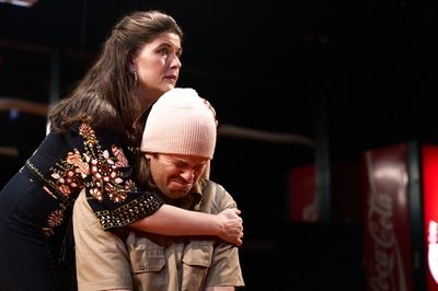 The play, subtitled "Memories from the Visit Room," takes place in the visiting room of a county jail, not unlike ones where both the playwright and director Benjamin Viertel have said they have recollections of sitting in for awkward conversations with incarcerated family members under the watchful eyes of guards, along with other families attempting to have similar conversations. A cast of seven portrays 15 different characters who cross paths in an open space that looks like any number of institutionalized settings: a few scattered folding chairs, industrial overhead fluorescent lights, and a couple of soda and snack machines off to one corner. It is an uninviting space where, as one character puts it, "the air smells like it's been recycled from a funeral home." The inmates are men whose crimes are mostly tangentially examined and whose personalities are sketched in shorthand: the angry one, the naïve one, the bullied one, and so forth. Their visitors are the women in their lives: girlfriends, wives, and mothers who routinely make the long trek to try to have heart-to-heart talks in a place that precludes much beyond the superficial. Perhaps the most dramatically compelling of the visitors is Arlene (well played by Carol Todd, who perfectly captures the image of "trailer trash," loud and inappropriate in dress, bearing, and behavior). Arlene is the mother from hell, who holds her son Chad (Christopher Mowod) in her thrall through a combination of dependence and humiliation that he is unable to break. Their relationship, and the toll it takes on Chad, comes closest to providing the play with a narrative arc. Towards the end, Arlene has a moment when she uncharacteristically asks, "why can't a jail be like a treatment center, somewhere you graduate from instead of sitting, vegetating, getting nowhere?" It's not hard to imagine that this question lies at the heart of the intent of Between the Bars. But there is insufficient character development or empathy building to get to the rallying cry for prison reform. Instead, we are mostly left with the "sitting, vegetating, getting nowhere" part.