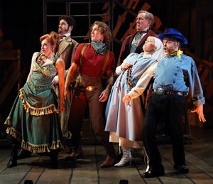 Kellogg reduces the Bard's dramatis personae down to a cast of six. On James Morgan's cheerful, comic-book set, Johnny Blood (Conor Ryan, with an ingratiating hangdog look and a walloping tenor) is about to be hanged by the territory's governor, von Richterhenkenpflichtgetruber (Nick Wyman, employing a fun Harvey Korman German accent). Note that name, as it's pretty characteristic of the humor level. But the jokes are so constant, and director-choreographer Bill Castellino's touch so deft, thatas in, say, The Book of Mormonthe atmosphere becomes supercharged with hilarity, and even the lesser gags land. These include punny street signsMane Street, and Bridle Chapel for weddings, because, you see, it's the West. In the governor's office hangs Justice Stops Here, and in his bedroom, Justice Sleeps Here. Silly, I tell you. Von Richterhenkenpflichtgetruber will spare Johnny's life on one condition: that he may deflower Johnny's novitiate sister, Susanna (Emma Degerstedt), who's about to become Sister Mary Jo. Sheriff Green (Peter Saide, who takes a while to warm up, but stays in the proper state of daffiness once he does) urges her to accept, but she won't, leading to Plan B: Switch her in the dark with Bella (Lauren Molina), the bawdy dance-hall girl who's also Johnny's main squeeze, and who's already been deflowered many times over. That's pretty much it, except Kellogg also plunks down a romance between the sheriff and Susanna, and their saving-Johnny's-life scheme also involves deceiving Father Morse (Gary Marachek), a very unclerical cleric who drinks too much, questions God's existence, and has a thing for Nietzsche. Whom he rhymes with "peachy." Did I mention the whole thing is in rhymed dialogue, not just the songs? This is a mixed blessing. On the one hand, it's clever, and some neat jokes and rhymes are crammed into all the iambic pentameter and other meters. (The about-to-be-hanged Johnny, to Bella: "I would love you till I die." Bella: "Six more hours? What a guy.") On the other, it gets us in the habit of listening for the rhyme so hard that some relevant plot information risks going ignored, and anticipating the rhyme sometimes spoils the joke. Give Kellogg an A for effort, though, and a B+ for execution. He's unstinting on the sight gags, too: A key Act Two confrontation even hinges on duplicating the famous mirror scene from Duck Soup, which Molina and Degerstedt carry off fabulously. Molina's a wonderful Bellathroaty, saucy, and she even dances in character. And Degerstedt, saddled with executing one of musical comedy's hoarier conventions, the I-suddenly-realize-I'm-in-love ballad, makes "What Is This Feeling" warm and appealing. Kellogg and Friedman are in good form throughout: You'll almost certainly exit humming "It's a Beautiful Day for a Lifelong Commitment," Bella's "It's Getting Hot in Here" is a frisky diegetic that also tells us a lot about her, and "In the Dark," the Act One finale, distributes its verses smartly among all the principals, revealing something about every one of them while forwarding the plot. David Hancock Turner leads a foot-stomping four-piece band, including, of all things, a mandolin. "Audiences are loving it," said set designer Morgan, who's also the York's artistic director, in his traditional opening remarks, and this audience sure did. There's nothing innovative about Desperate Measures, which, every note and every word, sounds like it could have been written in 1962. But hey, that wasn't a bad era for musical comedy. This one's as escapist as escapist can be, and with so much to escape from in 2017, that's a valuable service. My favorite moment may have been Johnny accusing the free-loving Bella of "betrayal," and she replies that that's pretty lame, "even from a may-ull." A vowel-bending, show-my-prowess-be-a-lion-not-a-mowess trick rhyme of the sort we used to count on from Yip Harburg or Johnny Mercer, and how we've missed such things. Welcome back.