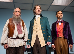 At its core is an interesting concept, based on the historic fact that each of its characters, Jefferson, Dickens, and Tolstoy, wrote his own interpretation of the Old Testament. The premise here is that the three find themselves in some sort of holding room of the afterlife, apparently sent there by God in order to accomplish something, perhaps, as they deduce, to integrate their separate Gospels into a universal and singular one. A reasoned debate would seem to be in order. But the playwright has opted to give us a quarrelsome and self-important trio that is unable to find common ground. And, in this production at least, the whole thing comes off rather like a debate among unruly middle school students. Tolstoy (Thom Sesma) is the boastful and quick-to-anger bully, mostly targeting the class clown, Dickens (Duane Boutté). For his part, Dickens dances and prances about the stage, rattling off (in a cloying affectation of British English) his great successes as a writer, and dropping lines from his famous works at every opportunity; "This is the worst of times," he declaims at one point as Tolstoy stabs him with a pen. Meanwhile, the genteel Jefferson (Michael Laurence) is saddled with playing the role of the hapless substitute teacher, trying without much success to manage the behavior of the other two. ("Count to ten," he tells Tolstoy. "Perhaps we should not physically harm each other.") There is little more to the first half of the 85-minute play than these sorts of shenanigans that dominate the action as each of the characters tries to sell the other two on his version of the Bible. Ultimately, the task to which they have set themselves proves to be unresolvable, as they childishly argue about every point of disagreement and cannot find common ground. Later, the play takes on a more sober tone, as their initial goal is replaced by a new one, that of mapping out a path to redemption. As Jefferson puts it, "Is the world better off for our having lived?" Each of the characters must, with humility, confess his flaws as a human. Tolstoy and Dickens must own up to their failed personal relationships, while Jefferson must come to grips with his dealings with slavery. It is in this section, as we finally move away from the foolishness that came before, that the play takes on some heft, though in this production, it is a matter of too little, too late. Director Kimberly Senior might have found a more harmonious approach for reconciling this serious question with the outlandishness of the performances she has drawn from her actors for most of the evening. What is lacking that might have served the purpose of creating that elusive balance is the kind of surreal and breezy playfulness that the Marx Brothers were able to capture in their heyday. Instead, this clumsily rendered production only manages to emphasize the play's inherent flaws, in which the big questions it poses are addressed only superficially in favor of way too much posturing and clowning.