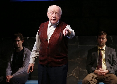 This is a work, after all, that's fueled by snake oil. McPherson, long a dramatic champion of the Irish working man, has apparently believed that, as with many of his other works (The Night Alive, Shining City, The Seafarer), extraordinary character may be unlocked within the distinctive ordinariness of the three men he chronicles. He wraps this within a tale in triplicate of loves (yes, plural) gone wrong, and delivers them in the form of some 15, mostly disconnected, monologues that the actors and their director must unite into something both cohesive and compelling. When director Henry Wishcamper brought together Brian D'Arcy James and Jim Norton for two of the roles in the 2008 New York premiere production (the play was originally performed in London in 2001), that happenedbut even then, only to a degree. There's only so much anyone can do to enliven what amounts to oral history about unremarkable events, in which even those speaking try to shirk from the notion that they actually participated in the events they described. Though director CiarĂ¡n O'Reilly has captured a vivid snapshot of the inertia that governs the lives of the young Kevin (played here by James Russell), the middle-aged Dermot (Billy Carter), and the older Joe (Peter Maloney), he hasn't been able to guide his performers even gently beyond the point where this might translate into engaging drama. The actors must work incredibly hard (perhaps too hard) to draw you into their characters' experiences; here, it's as though you're eavesdropping on someone else's private conversation in a noisy bar: You catch the words, but none of the emotional or psychological context that might elevate them. Maloney comes closest in his explanation of how Joe courted the idea of romantically pursuing his wife's friend while his wife was recovering from an operation. Combining as he does a youthful energy with a world weariness and dark notes of regret in his voice, Maloney capably evokes the sense of being torn between past and present, or between fantasy and reality (in Port Authority, there's not much difference). He wages that conflict in his eyes, sparkling but sad, as though he can see in both directions at once and isn't sure in which he should move. Because this is the most significant thread that unites the men, it's a quality that should show up in the other actors' performances, but never bubbles to the surface with equivalent force. Kevin, tasting for the first time independence and the ravenous appetites of the fairer sex, seems too at ease: Russell may be suggesting Kevin's one-dimensionality, but he also needs to be haunted by possibilities, and Russell's sunny demeanor banishes all trace of shadows. Carter's Dermot swings in the other direction, bearing a crippling, self-conscious complexity that prevents him from building the wall of contentment around himself that must eventually be torn down. One of the lessons of the evening is that there's no good use for such walls; even Charlie Corcoran's scenic design, which depicts one of stone against an endless field of disjointed blue sky (lighted by Michael Gottlieb), seems to threaten the men and us as it towers above, and casts shadows on, our comfortable existences. For the play to work, we'd need to feel like we're constantly in danger of it tumbling down, something neither McPherson nor O'Reilly encourages. When so much is so safe, it's just not that easy to buy what boring, self-involved people are selling, and there aren't many other kinds to be found in this Port Authority.