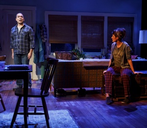 This is a play about strangers reaching out to strangers via an actual online advice column called "Dear Sugar" that was written by Cheryl Strayed between 2010 and 2012. Strayed turned the columns into a best selling book, and the writer and actress Nia Vardalos has adapted that book into the play. Ms. Vardalos also stars as the pseudonymous "Sugar," whom we watch reading and responding to the e-mails that have been submitted to her. Those advice seekers are represented in the play by the other three cast members (Teddy Cañez, Hubert Point-Du Jour, and Natalie Woolmans-Torres) who circle Sugar and recite as she reads on her computer. Many of the letters are quirkily funny, like the one from the woman who has an "arrangement" with a married man, who pays her for her services. She wants to know if this is taxable income. Others are along the lines of "should I leave my spouse?" or "should I indulge my partner's sexual fantasy?" Sugar handles these kind of queries with a few pointed replies. But it's not so easy when the cries for help come off as genuinely heartfelt, like the one from the woman who miscarried six months into her pregnancy and cannot get over her loss. Or the transgender man whose long-estranged parents want to get back in touch with him. Only a curmudgeon would be immune to these pleas, and Cheryl/Sugar is no curmudgeon. She responds to these letters with both advice and love, infusing her answers with stories of her own difficulties, troubled relationships, and a bout with drug addiction. And there is that transcendent moment between the columnist and a man who is desperately sad following the accidental death of his son. As performed by Ms. Vardalos and Mr. Cañez, this is the emotional high point of the play. His pain is palpable, and her response is the embodiment of empathy and kindness. It is breathtaking. Director Thomas Kail has brought the stories as far off the page as possible, by putting the strangers' words into the mouths of the supporting cast members who are constantly crossing Ms. Vardalos's path as she sits at her computer or moves about scenic designer Rachel Hauck's suburban home setting (but without ever an anchoring glimpse of Cheryl's husband or children). But no matter how much affection and design went into the production, it remains a nagging truth that none of the interactions is really taking place. The cast members we see moving about the stage like ghosts do not represent characters. They switch identities at the drop of a hat, leaving us with a constant reminder that the only character being portrayed here is Cheryl/Sugar. Both the queries and her responses are filtered through her giftedness as a writer, so that everything we see represents an aspect of her ability to manipulate the story (and the audience) through her literary talents. This is what is troubling about Tiny Beautiful Things, not that it isn't heartwarming (it is), but that it is too crafted. In the end, it is less of a play than a book talk.