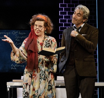 Final Follies is not only the name given to the entire production, it is also the title of the first short play, something that Gurney completed shortly before his death. It tells the tale of Nelson (Colin Hanlon), the scion of a wealthy family and a man who has failed in every business enterprise he has vaguely put his hand to. Now Nelson has decided he will take a stab at acting. Much to the chagrin of his older brother (Mark Junek), however, the acting career Nelson has in mind is in porn films. The whole thing comes off as a bit of fluff, an amuse-bouche about the aimless life of a man who skates through it all by relying on charm and the indulgent generosity of his grandfather, played by Greg Mullavey, a master at keeping this sort of soft satire aloft. The two plays that follow pack more of a punch. An early work, The Rape of Bunny Stuntz, is in the vein of one of John Cheever's short stories about the secret lives of seemingly upright suburbanites. Bunny Stuntz (Deborah Rush) is a no-nonsense matronly type who is about to take charge of a community meeting. She has brought her notes and materials for the meeting carefully tucked away in a small metal box, but she cannot find the key and is unable to proceed. Things quickly deteriorate as Bunny announces plans to run home to fetch the key while everyone else adjourns to the basement for "coffee." Before you know it, the coffee has been replaced by beer, and the whole thing has turned into a wild party. Meanwhile, Bunny, who has remained upstairs, is being harassed by an unseen man who has pulled up outside the meeting hall in his red Impala and dangles Bunny's missing key. Is he really a threatening stranger, or is there more to Bunny Stuntz than meets the eye? It's all very mysterious and quite entertaining to watch the thin veneer of civilized life melting away before our eyes. The final play of the evening, The Love Course, is a farce about a pair of college faculty members, the flighty Professor Carroway (a very funny and off-kilter Betsy Aidem) and her colleague Professor Burgess (Peter Marek). They have spent the semester co-teaching a course in romantic literature, and this is to be their final lecture together. As in The Rape of Bunny Stuntz, things quickly crumble as we learn that the content of the course and the personal lives of the two professors have become entwined in unexpected ways. Everything plays out in front of the class in crazed comic fashion, with Betsy Aidem a standout at capturing the flibbertigibbet spirit of her character, caught up in all the dramatic romance within the works the class has been studying. Director David Saint generally keeps things spinning at a rapid pace, especially with the more richly constructed Bunny Stutz and the comical Love Course. The best thing about the evening, though, is the opportunity it presents for audiences, who might be more familiar with Gurney's Pulitzer Prize-nominated Love Letters, to get a sense of the scope of his shorter works that manage both to puncture the upscale WASP world Gurney himself grew up in and to lament its passing, just as his friends and fans lament his.