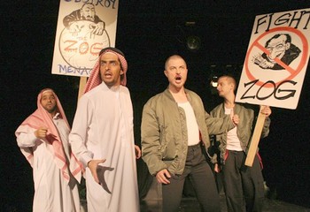 From the perpetually clueless heel of an American President with a sordid past and a Jesus fixation to law-enforcement antics and a sextet of lovers as bumbling about each other as they are a plot to blow up the Brooklyn Bridge, The Beastly Bombing draws from the oft-accessed wells of newspapers' front pages and the Gilbert & Sullivan oeuvre. In fact, finding much originality in librettist-lyricist-director Julien Nitzberg and composer Roger Neill's show proves almost as tricky as tracking down Osama bin Laden. Puttering patter numbers for President Dodgeson (Jesse Merlin), devil-may-care duets for his daughters (Heather Marie Marsden and Kate Gabrielle Feld), and mock-angry anthems for the Al Qaeda and white-supremacist operatives (Andrew Ableson and Jacob Sidney) they fall for do not immediately a good spoof, or a good show, make. Nitzberg and Neill highlight the humorous romanticism at the center of the story, turning into a revolutionist's On the Town, that idealizes difficult love while downplaying the dastardly deeds that give story what heft it has. For example, much more is made of the third coupling - between the other Al Qaeda and white supremacist, played by Russell Steinberg and Aaron Matijasic - than of the explosive plot being hatched. Unsurprisingly, the President is portrayed as being a greater threat to the world, far more concerned with appearances than he is the country being blown out from beneath his command. While there's no reason this couldn't work, The Beastly Bombing never convinces that the Victorian-era England treatment that's been applied to it is itself worthwhile, let alone necessary. Nitzberg and Neill go to extravagant lengths to make room for arias, vivid ensemble numbers, and social commentary with exactly the kinds of plot twists and deus ex machina resolutions that characterized Gilbert and Sullivan. But because none of the characters speak or sing in a language recognizably their own, any points the authors are trying to make by equating their show with The Mikado or The Pirates of Penzance never materialize. The absence of real wit does not aid the show's assimilation as satire, but rather paints it as obvious comedy that revels in being obvious. Songs about psychedelic mushrooms, the joys of Jew hating, and the misguided morals of secretly homosexual Catholic priests don't obtain comic credence merely by their very presence, and nothing aside from their tongue-twisting provenance and breakneck speed (performed, not always in sync, with an unfortunate-sounding set of pre-recorded orchestral tracks) gives them reason for inclusion here. Only Kevin Remington's frenetic choreography, which injects real athleticism into its host of unlikely targets, supplies energy enough to propel the action to its conclusion. With a Saudi doing somersaults, a chorus line of women in burqas, and a priest straight out of the Susan Stroman school, the dances realize the theatrical possibilities of The Beastly Bombing for more than the writing does. The performers, while vocally impressive, can't generally compensate for the cleverness and character they're missing. The exception is Merlin, who wisely avoids a warmed-over George W. Bush caricature and instead piles on the basso profundo that's just right for the egotistical head the self-absorbed nation Nitzberg and Neill have drawn in The Beastly Bombing. At his best, Merlin's manner and voice suggest the drop-dead seriousness of a dynamic divo better equipped for tackling a modern major-general than a contemporary commander in chief. If Nitzberg and Neill's goal was to make you wish their President were doing anything else, mission accomplished.