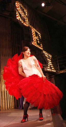Yes, Cho strips everything away in a dance number that combats the repression of Chinese Communism with a few good, old-fashioned bumps and grinds. Unashamed, unabashed, and most importantly undieted, she uses her dance to once and for all assume public control over the image that once cost her both her health and her mid-1990s sitcom All American Girl, and one can't help but be inspired by the personal liberty she's developed and displays so willingly. The Sensuous Woman, however, never imparts that same sense of grand accomplishment when anyone other than Cho is at its center. The eight other cast members, all drawn from the world of countercultural comedy and burlesque, further Cho's goal of presenting the full spectrum of attractiveness that's not confined (in reality, at any rate) to hourglass figures and six-pack abs. But their focus is so narrowly aimed away from the conventional that rapid-onset déjà vu is the most you can expect to feel from them. What the show gets right is its immediate dispelling of your fascination with the extreme exotica of it all. Following an excerpt from Cho's culturally and politically charged stand-up, the first number finds dwarf dancer Selene Luna emerge from a baby carriage and doff her dainty duds with the blistering self-assurance of Gypsy Rose Lee. Once it's obvious what you're in for, it's easy to clear your mind and expect the unexpurgated. But with gay rap numbers ("I'm a sexual homo!"), intercourse simulated through Spandex bodysuits, and Lady Justice (Miss Dirty Martini) revealing that money is what truly inside her heart (as well as, ahem, several other places), the desire to shock quickly overwhelms the desire to inform. This gives the show a creaky countenance that even the more meaningful and personal performances, chief among them Ian Harvie's ruminations about living as a lesbian, struggle to overcome. Admirable as all this inclusiveness might be, it ultimately does more harm than good. With careful direction by Randall Rapstine and bubbly choreography by Kitty McNamee, The Sensuous Woman has no difficulty filling the stage, and Steven Capone's back-alley set and Josh Monroe's lighting also help set the proper down-and-dirty tone. But nothing, other than Cho, succeeds at making the ignored enticing for more than a few seconds at a time. That's because she doesn't rely on gimmicks or artifice, but instead trusts in herself and her own terms of endearment. Abrasive and loud she might be, but dishonest she's not; in discussing her open approach to sexuality, she admits, "I'm not bi, I'm I," reflecting her obvious desire to make people happy, by any means necessary. While a few of the details she divulges about how she does this aren't really printable, they - like most of the monologues she performs - have side-splitting humor down pat. "I just love everybody," she says early on, "and I want everybody to love me." Understandable though that might be, the diversions here don't make it easy as Cho herself does. She's learned how to love herself, and as a result it's hard not to love her, even if that affection never fully translates to the rest of the sensual, imperfect world she presents in The Sensuous Woman.