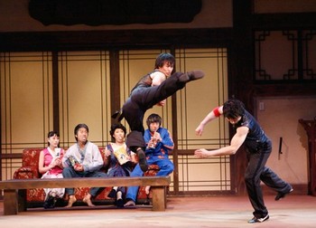 This live-action Jackie Chan-meets-Crouching Tiger, Hidden Dragon outing imagines what would happen if a pair of overconfident burglars tried to loot a house belonging to a clan of Korean martial-arts experts. The answer, of course, is that the family dispenses its own personal brand of justice, dividing into as many combinations and executing as many of their trademark moves as the show's fight choreographer (Gye-Whan Park) and running time (90 minutes) will allow. With blacklit and strobe-lit scenes, outright slapstick (only the cream pies are missing), and even a "Dueling Banjos"-style dance-off between two of the younger characters (the choreographer is Young-Sub Jin), it's clear that Jump wants to cover all the bases, which it does with an adequate amount of foreseeable flair. Director Chul-Ki Choi has made sure that happens in the most family-friendly way possible: Rather than dwelling on felling the interlopers, the family is more interested in confusing, containing, and converting them, even convincing the ne'er-do-wells to come over to the light and study the art of real self-defense - and, by extension, self-control. It's all so nice, it's hard to shake the feeling that most of this exists to serve as a reminder to Jump's target audience of eight-year-olds that they shouldn't try this at home. Given the performers' obvious expert training and remarkable physical fitness (nearly every male doffs his shirt to reveal a chiseled midsection; the two women are themselves svelte and toned), there's not much danger of that. With no characterizations to speak of beyond archetypes of the traditional Korean family, few consistent actors from night to night (seven of the nine roles are double cast), and a story deriving most of its laughs from the dorky Son-in-Law becoming a world-class butt-kicker whenever his face-clinging spectacles come off, there's just not a lot to latch onto for the long term. The routines' anemic nature is occasionally broken by some more-entertaining-than-usual bouts of audience interaction, which begin before the show does with an impossibly ancient man (an ingratiating Woon-Yong Lee) needing help from as many onlookers as possible to get on the stage. Random men and women respectively also get turns as a secret weapons broker forced into a game of one-upmanship with the family's show-off and as the object of the Uncle's frequently misplaced affections. It's the unpredictability and potentially reluctant guest stars in these brief scenes that give Jump its most invigorating and distinguishing moments. Multiple takes and quick camera cuts can ultimately lead to far more elaborate battles on film than onstage. But dragging someone up from the comfort and supposed safety of their seat to participate in the madness themselves? You can't get that at the movies. Everything else, though, is only a Netflix subscription away.