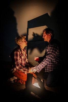 In fact, the website for Culture Lab LIC, that very cool non-profit visual and performing arts center tucked into what used to be a Long Island City warehouse, cautions that, among other things, the venue's new offering contains violent language, raised voices, the ingestion of rocks and bugs, references to cannibalism, blood, gore, and misophonia–a checklist that, judging from the reaction of my plus one when I invited her, may very well attract as many playgoers as it could potentially repel. I'll add that I'm Going To Eat You Alive, which earned the playwright their second Eugene O'Neill National Playwriting Conference Semi-finalist Honor, also contains an effective balance of plain speak and poetics, matched with intriguing originality and an adventurous spirit, all wrapped up in traditional horror genre tension. The play centers on the gently introspective Roach (Kai Justice Rosales), whose uniquely motivated passion for geology has inspired them to hit the road solo in a van for a cross-country camping tour of U.S. National Parks while vlogging a "rock-umentary" titled "The Grand Mineral Compositions of America's Greatest National Landmarks." Projection/sound designer Mark Alberto McKnight offers snippets of Roach's work, but a more revealing topic would be the young scientist's affliction with pica, an eating disorder that addicts them to nonedible items. In Roach's case, rocks. Apparently, phone and Wi-Fi reception isn't very good out in nature ("10,345 unread emails.") and as the 10th anniversary of their mother's death approaches, Roach's sibling Ez (Danielle Breitstein) has been frantically trying to get in touch with news that August (Alvin Christmas), an imprisoned someone from their past, is out on parole. Ez fears Roach's internet posts may leave them vulnerable to being found. As the 80-minute play leaps back and forth in time, we collect hints of how the gregarious August, who also has a unique relationship with aspects of nature, has influenced Roach to have a more personal connection to the outdoors that goes beyond formal education at the local discovery center. There are also suggestions about the night their mother died, with the play climaxing with a gruesome and graphic reunion. In addition to the traditional horror genre theatrics, McCarthy has discussed in at least one published interview the play's subtextual exploration of issues pertaining to the gender-based dynamics of its trans and non-binary characters. This cis reviewer will leave it to those more qualified to comment on this aspect of the play. Rosales gives a nicely varied performance as Roach, deftly bouncing from naïve to romantically inquisitive to defensively sarcastic as scenes go forwards and backwards in time. Breitstein and Christmas are both solid in lesser-developed roles, with the former playing a violin solo of Haley Heynderickx's "The Bug Collector" and the latter doubling as a mysterious character named Something Lurking. Director Brandon Urrutia's production of I'm Going To Eat You Alive follows last year's workshop mounting at The Tank and, as is typical for Off-Off Broadway, the design team (set/graphics/props by Michael Ruiz-del-Vizo, costumes by Neka Cecilia Knowles, lighting by Paul T. Kennedy) is doing fine work with what appears to be a limited budget. McCarthy's script includes more details about the action than is fully realized at this level, and although inexpensive seats in the "splash zone" of the three-rowed theatre are offered, there was nothing splashing at Sunday night's performance. This, of course, is not a criticism, but an advisory that at this stage many of the aspects of I'm Going To Eat You Alive that earn its content warning are primarily what you can see in your mind. Part of the fun is to envision what might be done in a larger scale production, which, hopefully, will not be long off. I'm Going to Eat You Alive Through October 27, 2024 Culture Lab LIC 5-25 46th Avenue, Long Island City, Queens Tickets online and current performance schedule: CultureLabLIC.org