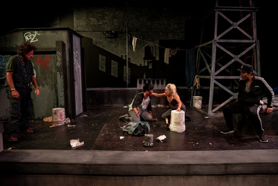 When an enraged man wielding a bottle of vodka emerges from the early-morning shadows shouting, "1-2-3 manhunt!", it soon becomes clear that we are not in a romanticized, pre-gentrified New York, but in the present, nearly-post-pandemic Lower East Side. Alex (in an impassioned performance by Santo Fazio) curses at the surrounding neighborhoods that are no longer the places he once knew. There are, he screams, no Italians living in Little Italy, no artists in SoHo, and even the Meatpacking District, once the domain of trans people, has been defiled with the establishment of expensive boutiques. The rooftops may not have changed, but to Alex, the streets below have been transformed by red-state transients, Chinese businessmen, and people who can afford to shop at Whole Foods. The situation is enough to make Alex want to throw himself off the roof, which he contemplates doing until a young man previously hiding in the crevices pulls him off the ledge. Alex's savior, coincidentally named Alec (performed with movingly confused innocence by Chris Paul Morales), is Chinese American, and as a target of blame for the spread of COVID-19, he has also become disillusioned with the city's reputation for acceptance and social progress. Fueled by vodka and the articulation of perceived political, religious, and familial outrages, the first act ends with the two men making a plan to wreak minor havoc on the city. The second act takes place the following afternoon, and Alex is asleep on the roof. He is aroused by two friends, Millie (a suitably tough and no-nonsense Ilene Kristen) and Frankie (portrayed as a charming grifter by Anthony Barile), who have been sent on a manhunt of sorts by Alex's wife. (The play's title refers to a children's game of hide-and-seek in which a heroic player can free those who have been sought and caught.) As his friends coax him to go home, Alex reveals the devastating family secrets that have brought him to the rooftop's edge. When Alec comes back, having committed a terrible act of violence, Alex, who is responsible for the crime, is given the chance to show compassion and heroically save this trapped individual. 1-2-3 Manhunt is simultaneously overwritten and underdeveloped. Act one is essentially an hour-long harangue about all that is wrong with the United States in 2021. People are likely to agree with the points about Trumpism, out-of-control capitalism, and religious hypocrisy, but the litany of complaints, no matter how passionately presented, becomes tiresome and repetitive. Except for some shared connections with Alex's and Alec's Catholic high school and allusions to family betrayals, there is very little character exploration. The shorter second act is much more successful because the characters' actions are rooted in personal histories and conflicts. Still, the playwright could deepen the characters' relationships. For instance, there is an indication that Alex and Millie were once romantically involved, but the background isn't clear. And except for learning that Frankie ingeniously scams the government, we know little about how him and why he is there. Under William Roudebush's direction, the cast finds moments of gentle humanity amidst the play's overriding sense of anger and disappointment. In addition to the excellent scenic design, Herrick Goldman's lighting and especially Andy Evan Cohen's sound design contribute to the charged atmosphere. The program also lists a special-effects designer, and I found myself waiting for a moment of surprise and wonderment. As far as I could tell, none ever arrived. Alas, New York City in its more sanitized form has seemingly lost its ability to shock and astonish. And that's a crime.