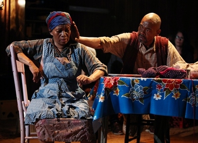 generations (the playwright opts for lower-case), a co-production of the Soho Rep and The Play Company, runs but 30 minutes, but it fills every one of those minutes with the universal rituals of family life that will make you smile at times, fill you with sadness at others, and leave you much to ponder as you consider its implications. Everything about the production, beautifully directed by Leah C. Gardiner, is designed to immerse the audience in the experience, from the dirt floor, to the spicy odors wafting from the well-used cook stove, to the odds and ends of furnishings and the scattered mismatched chairs where we are invited to sit. Standing and seated among us are the 13 members of a choir of singers who perform South African songs composed, arranged, and directed by Bongi Duma. The play tells its story through stylized dialog, both poetic and domestic, that is repeated in various permutations and ever-changing tones that reflect the mood of the moment. Much of it uses the imagery of cooking, a source of pride for the women ("I was the cooker who coached the cookless") and a means of teasing for the men, who endlessly debate over who is the better cook and even whether the younger generation can cook at all. ("Why would I cook? Mama cooks what I eat."). By continually reshaping the performance of these lines, the wonderful castheaded up by Jonathan Peck as Grandad and Thuli Dumakude as Grandma (whose facial expressions alone reflect a lifetime of experiences)tells us all we need to know of their joys, their playfulness, their anger, and, ultimately, their overwhelming grief, all of which is underscored by the singing by the very talented choir. In the end, when it has become increasingly clear what has been happening to this family over a relatively short period of timewhen Grandpa speaks of "this thing/this dying thing" that has turned the natural order of life upside downyou may leave the theater a little staggered by the experience, but you will also once again be awed by the amazing ability of dramatic storytelling to fully engage the heart and mind.
