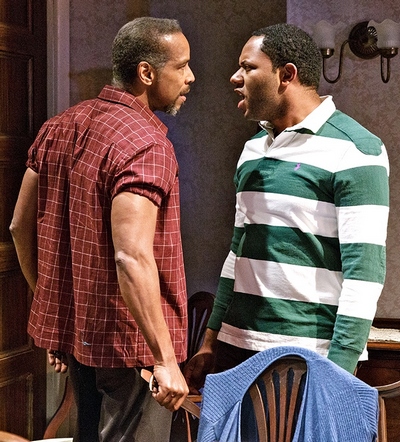 Though, to be fair, that's more or less what happened to Calvin (Larry Powell), a young black man from Pittsburgh, at some point in the not-so-distant past. He barely escaped from the loving, if frequently too tight, grasp of his mother, Maxine (S. Epatha Merkerson), after revealing that his relationship with her husband and Calvin's stepfather, Vernon (Kevyn Morrow), was, shall we say, not exactly a pure one. The only way for him to find his own identityas an adult, as a gay man, and as a Broadway starwas to vanish and begin again in New York. The repercussions of this act, on both Calvin and those he left behind, form the compelling spine of While I Yet Live, though the evening itself is somewhat less gripping. Porter, a forceful and rangy singer who last year won a Tony for his performance in Kinky Boots, obviously has a strong connection to the material and the people it documentsespecially Maxine, who is depicted with an effusive warmth and an all-encompassing devotion to her family and faith that transcends the mysterious disability, apparently acquired during childbirth, that's relegated her to leg braces and wheelchairs. And as long as Porter sticks close to these qualities, his writing is affectingly, inescapably human. Overall, however, there's a sloppiness to the storytelling that prevents total absorption of the latent emotions at work. The play is narrated by Calvin's younger sister, Tonya (Sheria Irving), from an indeterminate point (or indeterminate points) in the future, that allows Porter a vantage point for critiquing the religion that comes between the various family members. But this introduces the typical problem of events unfolding that Tanya is not present to witness, which muddies the waters as to what's happening, or why.