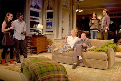 Alas, you must also forget your hopes that a visionary director may be able to salvage things. This production has one in Sam Gold, the quiet genius behind Circle Mirror Transformation and a number of other recent plays that proven his ability to find grandness in the most unassuming places. But he's stymied by Kazan's un-grand brood brooding because... well, if we spoiled that now, you wouldn't come back for the second act. The most he can do is push and pull his actors around, hoping they will eventually align into some configuration that makes sense. Through no fault of Gold's, that doesn't happen often. Sure, the individual elements track well enough. Alli (Jessica Collins) is days away from marrying Sandy (Jeremy Shamos), and Alli's mother Maggie (Amy Irving) is going nuts with the preparations. She's so time-absorbed that she's already opened all the gifts so the happy couple can get a head start on writing the thank-you notes. Dad Lawrence (Mark Blum) is just trying to stay out of the way, especially since youngest sister Dinah (Betty Gilpin), is due to arrive any moment from Juilliard, where she's going to schooland she and Alli don't get along well. Why? You're not supposed to ask that, either. Suffice it to say, it has something to do with Dinah's boyfriend, Daniel (Oscar Isaac), who's coming with her and planning to stay the weekend. He has a history with the family, too, having also made the rounds with Alli once upon a time. Everyone loves Daniel, but no one quite likes him, for reasons thatlike so much hereare shadowy for shadow's sake. Alli, however, isn't done with Daniel yet, and their reopening their relationship sets in motion a chain of events that will break the family apart at a pinpoint-precise moment in the second act, because pulling such strings earlier just isn't done. The addiction to the schematic, annoying as it is, is all that keeps We Live Here upright. Plays can survive a deficit of plot if the characters are rich and vivid. They've been known to surf to success on pure story despite containing people more charcoal sketch than flesh and blood. Heck, some can forgo plot or characters if there's a powerful controlling style and an unstoppable purpose propelling the action forward. But they can't survive solely on the fumes of tensionless suspense, as this one tries to do. At least this production is not completely bereft of positives. John Lee Beatty has designed a gorgeous quasi-rustic living-room set, which Ben Stanton has lit with autumnal flair. The performers, too, for the most part satisfy. Irving effectively melds angst and anxiousness in one woman forever on the verge of losing control, Blum presents a virtuosic picture of a man who long ago ceded his emotions to others, Shamos adeptly charts the good-natured guy stuck between warring extremes, and Isaac summons the proper air of sultry mystery to cloak the transformative Daniel. Gilpin and Collins are looser than their cast mates, but believably fill out the periphery of this shattered clan forever questing for glue. But there's nothing for any of it to add up to. The problem isn't merely that Kazan doesn't know what story she's telling or why she's telling it, as her overriding focus seems to shift every ten minutes or so. Nor is it that she doesn't know how to craft her ending, and surrenders to temporality by catapulting everyone into chaos, unrolling some more circuitous dialogue, and then calling it quits. It isn't even that none of the revelations intended to push us to the edge of our seats can so much as set our neck hairs tingling. No, what's wrong is the atmosphere of self-importance that blocks out everything else. Kazan, who's better known at the present for her acting roles, may believe that audiences are willing to endure her directionless dithering around different branches of the narrative, or that there's something clever or cosmic in naming the daughters of a classics professor Althea and Andromeda. (Oops, did I give something away?) But there must be substance to back it up; Tony Kushner plays similar games in his writing, but Angels in America (which, not coincidentally, Kazan appeared in at Signature a season ago) is about something. We Live Here is not. At best, it turns on a notion: that, for supposedly good reasons we have to wait to hear, no one in the house can truly talk to anyone else. But Kazan has commiserated with her own characters and discovered what makes them tick, let alone why it's so vital that we know who they are. Their troubles are severe, yes, but not so impenetrable that genuine connection can't salve over the wounds. That they never remedy things during the chances they have is strictly because of writer fiat. From the audience, that looks more listless and languid than it does any kind of profound.