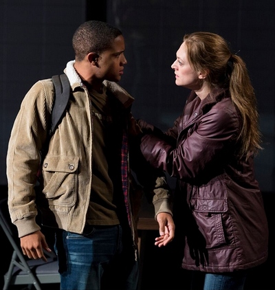 Koogler paints a dynamic but unforgiving picture of life on this particular edge, and Neugebauer has staged it in stark, emotionally claustrophobic terms. (The set, by Daniel Zimmerman, is wide but confined, and appropriately unsettling in how smoothly it transitions between the slaughterhouse and ostensibly friendlier climes; Ben Stanton's lights likewise threaten to slash the skin with each drastic change they make.) Though this is Koogler's professional playwriting debut, he displays a keen sense of voice with regards to the awkwardness beneath everyday expression, and has structured the 90-minute play's many two-person scenes with an almost surgical precision that reinforces the discomfort all these people have in dealing with each other. There's a sense of thoughts being constantly interrupted, yes, but much of the time no one convinces you the thoughts were worth thinking in the first place. To them, their lot and their prospects are just that worthless. But for all that Koogler does well, and for the obvious talent he displays that should be nurtured, Kill Floor is not at all satisfying. The tripping-over-language style, though bracing in the early scenes when it's still new, loses most of its impact when it's all you ever hear. (The longest "speeches," to the extent they can be called that, are Brendan's, and even those are at their best meanderings through his own troubled perceptions.) Koogler ably draws disquieting parallels between Brendan and Andy's paths, but does so with a heavy hand rather than the subversive touch that might be more affecting. And, though Koogler undoubtedly wants to highlight the violently cyclical nature of the pair's fraught relationship, his stopping point for the action feels too nakedly arbitrary to arouse any sense of finality at all. Accidentally deleting the last 20 pages of the script wouldn't have played more random. Such infelicities result in that unique paradox of a play that's loaded with a compelling story but does not in itself compel, and is filled with precisely articulated characters who convey little in the way of pulsing blood beneath their skin; this leaves the actors underequipped for the task of rounding out their roles. Ashe, Levine, and McCarthy are all solid, but don't have that many nuances to explore. And despite having the least amount of stage time, Gold brings a haunted compassion to Sarah that reveals her as someone like Andy, but whose choices worked out slightly differently. As for Ireland, she infuses Andy with enough pain to let us see why she's hollowed out inside: She's been forced to fight herself just as much those around her, and Ireland's calculated movements and gentle but stern line deliveries unveil plenty of bruises and scrapes that just haven't healed properly. All of that has built up to make Andy the pitiful, disjointed creature she is, and she's lashing out against her lack of options. Ireland's portrayal is rooted in frustration and flattens out after a while, but it makes something sharper out of what's naturally fuzzy. For Koogler to live up to the promise he displays here, he needs to expand and deepen his focus, and be willing to give us more to view, more to gnaw on, while still maintaining a grasp on the mystery he so clearly loves. We don't need all the answers; heck, most theatregoers probably don't want all the answers. But too often we're like the Parnell cows: moving blind, waiting for the crack of completion that never arrives. The difference is, the cows don't need to know where they're going or why their journey matters. We do. And that's what Koogler hasn't provided in Kill Floor.