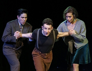 Even that knowledge, however, makes things inspiring rather than depressing. The way playwright David Auburn (Proof) and Stephen Oremus (the original musical director, who crafted the vocal arrangements and orchestrations) transformed the one-man piece into this beautiful, deceptively complex three-hander never ceases to amaze. The way they spin the tale of how Jonathan finds himself just in time for the world to lose him is as moving as you'll find in any contemporary musical, in part because it's inextricable from the ethos Larson himself reportedly lived and described in one of Rent's most characteristic numbers: "No day but today." No production I've seen since the original (including the high-profile Encores! Off-Center misfire two years ago) has done more than this one to highlight the urgency beneath the uncertainty for everyone, not just Jonathan. Susan and Michael are every bit as important in this conception, emerging both as avatars of Jonathan's insecurities and wounded souls in their own right. Salazar marshals an overeager bitterness, even rage, that so stuns with its concentrated force that you don't mind many of his early lighter line readings. And Renée is luscious in at once depicting Susan's erotic abandon and her homespun yearnings, and putting her arresting (if not huge) belt voice to outstanding use during the climactic power anthem, "Come to Your Senses," that sends a permanent Jolt through Jonathan. Blaemire is more remarkable still. Though he lacks the earthquake-inducing high notes the hard-driving score calls for (and that were the unique calling card of the first post-Larson Jonathan, Raul Esparza), his singing is otherwise excellent and an airtight match for the broad, grinning personality he uses to mask a gradually emerging darkness within. Pairing this with precise comic timing, he lets you view each of Jonathan's colors at full saturation, resulting in more scenes that elicit simultaneous laughter and tears than in perhaps any other musical I've ever seen. He's also a dynamite piano player, which piles on additional resonance during "30/90" and "Why" as you see and hear, without obfuscation, exactly what's about to be lost. At its best, the show is emotionally overwhelming, with Silverstein ensuring maximum impact through his crisp, focused staging and smart application of Jennifer Paar's costumes and Josh Bradford's lights. (Musical director Joey Chancey leads the four-piece band with spine-shattering gusto.) Even at its worst, the evening is well above average. The choreography (by Christine O'Grady) tends to be busier than it needs to be, causing a muddling of the lines and lyrics that emerge through Julian Evans's so-so sound design. And Steven Kemp's set, a mostly bare stage crowned with a graffiti-strewn ceiling, could go further into digging into Jonathan's subconscious. I'm not sure the rest of this production couldit's as good as you could hope for, and a stirring reminder of the boundless opportunities that still exist within life and theatre alike. It speaks so deeply, and yet so affirmingly, of the conflicts that drive us and make us human, that it will linger with you long after the last chilling notes have rung out. It's a shame that Larson didn't live to see what his "other" masterwork would become. But one thing's certain: He couldn't have asked for a better boom.