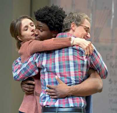 When they're not, Lee has more trouble maintaining narrative energy. Amy and Peter fretting over what they don't know about their son, and whether they've made mistakes along the way, is integral and deftly handled; but they're not well drawn otherwise, and the few details Lee provides (Peter smokes, Amy used to, they like eating curry for dinner, and so on) are too half-hearted to provide much of a third dimension to these people. And things are a little too structurally tidy and familiar: We hear more than we see of Luce's gregious brilliance, and his Culture Month Assembly speech consumes more of the characters' minds than it should and basically stops the show dead when it occurs. But the performances are stellar and keep you engaged even during the rougher spots. Hinkle etches every line of maternal and societal worry onto Amy's face, and conveys a permanently stunned attitude that's a sobering reminder of the cascade effects children's choices can have on their parents. Huff's stiffer, more businesslike take makes a fine counterpoint to Hinkle's approach, and his outbursts are even more affecting. If Onaodowan reads a shade too old to convince as a high-schooler, he masterfully blends Luce's placating and mischievous sides into a single personality that keeps you guessing throughout. So does Washington, who projects a crisp elegance and self-assuredness that anchor her within her world, but tinges her portrayal with just as much vagueness about her intent as Onaodowan does. I have my suspicions about what really went down between the two and you may have yours, but there's no way to know for sure. Wondering about this and the related issues casts new light on both Lee's characters and the world we live in, and that's enough to make Luce work. But Lee's ability to proffer, and maintain throughout 100 intermissionless minutes, the terrifying possibility that both Luce and Harriet are crusader and tormenter at the same time is what makes the play a success.