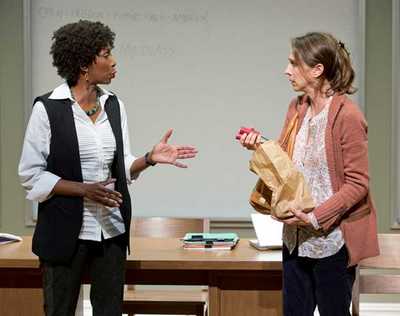 The teacher in question is Harriet Carter (Sharon Washington), who heads the World Cultures class in a tony charter high school. She feels a strong connection to the student, Luce (Okieriete Onaodowan), who like her is black and (unlike her) has survived some serious strife: He was born in the war-torn Congo, but adopted into an American family when he was still quite young, and although there were initially some fears he'd be volatile, he's mainly turned out spectacularly. An honor-roll student and quarterback on the football team, he's more than exceeded everyone's expectations. Maybe. He believes, you see, that Harriet wants him to be a symbol of his racehe just wants to be an ordinary teenager, go to an ordinary college, and live an ordinary life. And both Luce's and Harriet's goals are jeopaardized when she calls a meeting with Luce's mom, Amy (Marin Hinkle) to inform her that not only has Luce written a troubling paper in which he imagined himself as a bloody Eastern-European nationalist, but that she also found a bag full of illegal fireworksserious ones, not plain bottle rocketsin his locker. When confronted with this by mom and dad Peter (Neal Huff), he insists there's another explanation. Whether there actually is, and whether his version is necessarily more believable than Harriet's, is the crux of the play, and a big part of what makes this such a fascinating work. We see a couple of Luce's interactions with Harriet, and Lee has written them to be absolutely clear in the moment, but foggy in retrospect. I was positive, for example, that one of Luce's allusions to the fireworks was intended one way, but after hearing Harriet's explanation I started wondering whether maybe I'd remembered it incorrectly. And in the stunning penultimate scene, the facts about something Harriet experienced were absolutely inconclusiveuntil Luce had his full say.