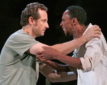 As there's no pretense of balance - assuming that's even possible - it doesn't take long for The Overwhelming to become a monochromatic polemic, with characters to match. Jack's deceitful servant Gérard (Chris Chalk) is a not-so-secret Tutsi hater. Government official Samuel Mizinga (Charles Parnell) is the living embodiment of evil flourishing while good men do nothing. Everyone else is a token ineffectual, especially the representatives of the various interested parties, from the U.N. and the U.S. to France and South Africa (they're played, most interchangeably, by James Rebhorn, Boris McGiver, and Owiso Odera). With so many characters occupying the shallow end of the dramatic pool, there's a heavier burden on the dialogue to convey the urgency of what's unfolding. There, too, has Rogers ceded the instincts of his inner playwright to his inner humanitarian. "A man who tells all is naked, a naked man is weak," intones one person early on. "It is easier to have an enemy than find a solution" opines someone later. More sage advice: "To speak truth is good, to speak all truth is not." To reflect the full scope of Hutu hatred: "AIDS is a Tutsi sickness." Last but not least: "Things that have not been seen... they are hard to imagine." Phrases and speeches of such suffocating triteness do more harm than good for a play that must explain so much in a short period of time (the running time is two and a half hours). Even director Max Stafford-Clark can't escape the clichés late in the evening when a key speech about turning one's back on evil is directed to the audience instead of Jack's family. Tim Shortall's unit community-square set, graced by a statue of the Virgin Mary buttressed by a stained glass window, a gaping hole where another once was installed, is one of the few things not satisfied with merely meeting expectations. Some of the performances shine through as well: Powell makes Linda a sophisticated victim in an untenable situation, while Robards and Stahl-David respectively employ restless hyperactivity and blandly libidinous detachment as their modus operandi. Cephas Jones, Chalk, and Parnell are moderately compelling advocates for their various points of view, and Washington brings an attractively calculated understatement to her pivotal role. The Overwhelming doesn't have much use for that, though. It's a work that insists and subsists on the broadest strokes possible, forcing everyone to work too hard to achieve what should be an effortless outcome. That's why it's not surprising that Rogers misses so many obvious avenues for making his points in subtler, and ultimately bolder, ways. One of the play's major themes is how communication breaks down as easily between those who share a language as between those who don't; Rogers finds some effective contrasts between scenes of Jack trying to convince others of the encroaching storm and the six-foot-thick barriers erected between conflicting speakers of English and French. But just as you start realizing that it's communication (or the lack thereof) that's bringing about the genocide, Rogers starts in again with his well-worn, stultifying speechifying. It's developments like this that prevent The Overwhelming from whelming much at all.
