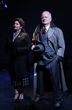Brecht famously wrote the play in a great rush of urgent creativity while living in exile in Finland in 1941, having fled Germany in the early 1930s as the Nazis were rising to power. Arturo Ui is essentially a satirical allegory about Hitler and his followers. Brecht, however, set the action in Chicago, subtitled it "A Gangster Spectacle," and transformed the characters into mobsters, with Hitler portrayed as an Al Capone-like figure. The play is not often produced, possibly because it is difficult to construct a consistent vision of what it should look like on stage. It requires some astute juggling of elements drawn from period gangster films, surrealism, and pedantic polemics, with touches of Shakespeare and Charlie Chaplin thrown in for good measure. Some productions have dressed the characters like Nazi officers, while others have maintained the mobster look. The latter is what the Phoenix Ensemble has chosen to do (credit Debbi Hobson for the sharp costume design). Craig Smith's Ui, the stand-in for Hitler, is a nebbishy sort of guy who surrounds himself with a band of thugs who want to strong-arm their way into taking over the cauliflower trade in Chicago and Cicero, Illinois. Given this patently absurd premise, it's not surprising that the best moments of the production occur when things turn surrealistic. There is a great set-piece, for example, in which Ui hires a broken-down half-drunk actor (John Lenartz) to teach him how to emote and gesture to the crowd. The pair of seasoned performers has a field day with this scene, which ends with Smith marching around the stage in mock goose-step fashion to the tune of "Yankee Doodle Dandy," bringing to mind Charlie Chaplin's portrayal of Hitler in his satirical film "The Great Dictator." Lenartz also plays a character called Dogsborough, a stand-in for Paul von Hindenburg, a German hero of World War I who, when in his 80s, was pressed into running for President against Hitler in 1932. He won, but he was unable to prevent the Nazi juggernaut that led to Hitler's rise to a position of absolute power. In Arturo Ui, the character falls prey to his own blind greed and willingly steps aside for Ui in order to protect his reputation. Among the rest of the strong ensemble, Elise Stone also is quite effective as a widow, made such, as she knows, by Ui's henchmen. In a scene straight out of Shakespeare's Richard III, she is wooed by Ui into joining his inner circle. Shakespeare is also invoked in the play's prologue (presented in rhyming couplets in Stephen Shakey's translation) and in an embedded performance of Marc Antony's famous funeral oration from Julius Caesar. Mostly it all works, although there are a couple of distractions. One of these is a framing device that offers up the play as if it were a radio drama. The stage is set up like an old-style recording studio, with stand mics, sound effects equipment, and the talented Ellen Mandel at the piano providing original underscoring. There are even a couple of Wrigley's gum commercials tossed into the mix. In truth, however, this comes off as more of a gimmick than a means of shedding light on things, and it is something of a relief when, for large portions of the production, the radio paraphernalia disappears altogether and the play proceeds strictly as a theatrical performance. Also potentially distracting are Brecht's additional descriptions of the events in Germany, here presented like pieces of movie newsreel clips from the 1930s. These are insistent reminders of the playwright's intended target. For Brecht, the actual events taking place in his native land were of paramount importance. The cautionary message cannot be presented often enough, that we must collectively resist men like Arturo Ui.