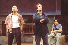 Most of the time, Machado handles this very well. The play's second act is mostly masterful in its construction, taking the more straightforward and dramatic story of the first act and transforming it into something still more universally meaningful. The acts are slightly uneven in tone - the second act, for example, delivers a far more comic punch than the first act suggests the place is capable of - but the play as a whole is written very tightly, with a firm grasp on the sensitive nature of some of the issues without dwelling on too much sentimentality. This is aided greatly by Michael John Garces, who also directed the Humana production. Garces has has provided some clever and compelling direction utilizing the tiny stage of the Cherry Lane and the three performers in such a way that the stage often feels nearly full. Not all of his ideas work, though; a few moments, particularly at the beginning and ending of the play, seem unnecessarily visually inconsistent with what happens in between. But with the help of Troy Hourie's sets, Kirk Bookman's lights, and Elizabeth Hope Clancy's costumes, the physical production never seems out of sync with Machado's work. The performers make their own vital contributions. Vassallo is particularly strong in his role. Though saddled with some improbable character developments, he makes everything he does seem thoroughly real and frequently touching. Solis, with his intense sense of humor, is particularly effective during the second act, when he is allowed to let go with the force of his character's feelings. MacVittie has the most difficult job as a stand-in for Machado and handles it well, but never makes his character come alive in the same way the others do. Machado reinforces the old notion that you can never go home again, but you can at least learn something along the way. Havana Is Waiting, while serving as a stark reminder of what home is, and what's truly important in our lives, remains an intriguing and thought-provoking play. Photo: Carol Rosegg