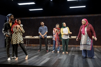 After a splash of Indian-sounding music, we're on Neil Patel's stark stage, a plain black floor and a sparkly silver back wall. Basminder "Boz" Batra (Shazi Raja), almost 30 and, to her parents, worriedly unmarried, is in the family's Wisconsin backyard, digging a hole, well played by a trapdoor in the floor; it's oozing smoke, for some reason. She's talking to some unknown presence in an aye-me-hearties pirate-speak culled from old movies, for reasons that won't become clear for quite a while. She's seeking a buried talisman left to her by her late brother, though that, too, takes a while to comprehend. Boz is planning to escape her dull little Indian-American community for the glamorous far reaches of Madison, an hour away, where she plans to open a bar. She's saved up, she has some financial backing that's never explained, and she needs that filial talisman for good luck. This on the eve of the wedding of her excitable brother, Iggy (Sathya Sridharan), to the sensible Lovi (Lipica Shah). Meanwhile, in preparation for the langar, or pre-wedding party (the script carries a full-page glossary, never a good sign), Boz's mom, Deepa (Purva Bedi), is mopping up the langar hall as her cousin, Simran (Angel Desai), cooks up a storm. They're gossiping about their extended family, and it's small talk, very small. Backhaus may be trying to impress upon us the ordinariness of these people; if so, she succeeds all too well. It is, to put it bluntly, not a fascinating brood. Boz's dad, Sunny (Alok Tewari), is hearty and fatherly, Deepa is practical and family-oriented. There's also Dadi (Sophia Mahmud), the nonagenarian matriarch, who's there to provide tart commentary. Only Boz has any compelling character quirks, and these take some time to unravel. She's sore because the family has invited her ex-boyfriend Vishal (Nik Sadhnani) to the gathering, a yo-dude-whatup sort of no particular distinction. And she's into all that pirate shtick because a pirate ancestor, Brownbeard, incited a mutiny on a beer ship a couple of centuries ago, a source of Batra pride. The festivities begin with a protracted dance Will Davis, the hardworking director, did the choreography. There's talk of Fiona Apple and Tinder. There's a cute bit where Dadi offers a wedding toast in Punjabi, which Sunny strategically translates leaving out the offensive, opinionated parts. A few assorted Batras sing a pirate chanty. Boz springs her escape plan on everybody, to be met with several pages of dialog protesting it. "Dad," she counters, "we're not in, like, 1979 anymore." Scene Two. Patel's set smartly turns into Boz's dive on the outskirts of Madison, which has been open a couple of weeks and isn't doing business. The only patron is Tim (Nate Miller). He's a somewhat dumb white guy in his 20s, and we love him. He gets Boz to explain some of the pirate motif and other matters that have been puzzling us up to now; she reels off some more Punjabi background and the whole history of India pale ale. Anyway, while Tim spikes the conversation with some unwittingly quasi-racist ramblings, he's clearly goodhearted and willing to help her bar survive its unpromising debut. Which is lucky, because Vishal bursts in with some devastating Act One Curtain news (accompanied by Elisheba Ittoop's elaborate pirate sound effects, for no reason I can figure). The news sends Boz rushing back home, as Tim soliloquizes, something a Tim would never do. Up to now, we've been busy trying to parse the complicated Batra family structure and the multiple backstories and Boz's off-putting, hard-to-discern, vaguely-Irish pirate palaver. The latter continues at the top of the next act, but this time it's wonderful. We're in Boz's head, and what a colorful place that is, with Sunny impersonating Brownbeard, the rest of the cast tricked out in Arnulfo Maldonado's astounding pirate costumes, and Boz imagining that long-ago mutiny, an act of rebellion and resolve that mirrors her own decision to set out on her own. It goes on a bit long, but it's an aural and visual feast, and it's almost a disappointment to return to that langar hall. Minor spoiler alert, but the family is dealing with a tragedy born of hate and stupidity, the kind we hear a lot about on the news these days. They're so matter-of-fact as they cook and clean and again prepare to receive a crowd, their coping mechanisms seem unnaturally strong, which makes the drama that much milder. Some more relationship conflicts get hashed out, and Deepa steps forward to break down the fourth wall and offer a can't-we-all-just-get-along speech. Honey, this is the basement of City Center, it's a largely subscription New York audience, and you're preaching to the choir. This is followed by a small coup-de-theatre, better experienced than described, that sends us out happy and fulfilled despite all the tangled, often confusing elements that have preceded it. The cast, a real ensemble, is fine, though one might expect more individuality and personality from Raja, who has the meatiest role by far but seldom dominates her surroundings. Tewari is both a sturdy paternal figure and a rip-roaring pirate, Miller an adorable doofus. Backhaus has talent, and India Pale Ale introduces us, however haphazardly, to a distinct and compelling culture. It makes a plea for tolerance that can't be overexposed, though it's sure getting plenty of exposure on current stages. You just wish it were laid out more clearly, and that the Batras possessed a few more eccentricities. Mopping floors and meaningless pop-culture allusions and petty familial arguments, bracing theater that ain't.