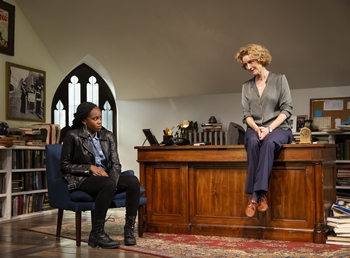 But the similarities between Mamet's play and Eleanor Burgess's are striking, and The Niceties, too, is likely to inspire hurt feelings and stubborn side-taking. Janine (Lisa Banes), a history professor, has a cluttered office Cameron Anderson did the convincing set, marked by stacks of books, like Dane Laffrey's for Apologia. Office hours are on, and the current visitor is Zoe (Jordan Boatman), a smart junior defending her paper. Her thesis "a successful American Revolution was only possible because of the existence of slavery" is, Janine agrees, original and imaginative and thoughtful. And wrong. Teacher and student are polite, respectful of each other those, we gather, are the niceties and relishing the back-and-forth of ideas. Until they're not. Burgess cleverly ratchets up the tension, with Janine maintaining her white-privilege poise as long as she can, and Zoe, being of her social media-savvy generation and into instant gratification, challenging and interrupting her at every turn. Burgess wants us to see them as equals, and doesn't entirely succeed. She writes, interestingly, in her author's note, "Conflicts between good and evil can be fun fodder for action films. But I'm more intrigued by times when smart, well-meaning people, with great values and the best intentions, fundamentally can't agree." Yes, it's a provocative, drama-packed premise how right is Janine, how right is Zoe, and can they find any common ground? But to this privileged white male, the balance starts tipping in Janine's direction, and more often than not stays there. "Great values and the best intentions"? Zoe, as she admits, is there for a good grade and nothing more, and doesn't have time to do the rewrite Janine demands because she has too much else going on she's protesting Howard Stern, attending a police reform rally, and organizing a revolt against Sandra Day O'Connor, who's visiting campus and doesn't have the strongest record on affirmative action. The play of ideas starts careening out of control. The discussion turns into shouting, and Boatman talks faster and faster, divulging well-worded opinions she can't possibly have come up with on the spur of the moment. If she just slowed down, maybe we could track her reasoning better. Janine, meanwhile, in Banes's calm, well-calibrated performance, is a voice of relative reason, to these ears at least. Zoe, she advises, needs primary sourcing to back up her thesis something practically impossible, as how many slaves in 1775 were literate, or able to openly voice their emotions. Is that fair? Certainly not. But Janine feels that just an "I know they felt that way" from Zoe is not enough, and Zoe resents that, deeply deeply enough to plunge on a mutually destructive course of action that results in a second act much like Oleanna's, with both parties' lives damaged, and the possibility of any accord between them increasingly remote. Sure, Zoe can feel things in her bones that Janine can't though it's revealed, in an elegant striptease of exposition, Janine knows something of unfair discrimination, too. Zoe makes some excellent points, and of course it's presumptuous and condescending of people from other backgrounds to assure her they know how she feels; they don't. But she's a kid, and by the time she's surreptitiously taping Janine's comments to post on social media, it's hard to stay on her side. Kimberly Senior's direction has some fine touches, like the way Zoe ends up sitting in Janine's chair later in the proceedings, a subtle illustration of an evolving transfer of power. But the three-sided seating area in Manhattan Theatre Club's Stage II is a little awkward, and no matter where you sit, you'll miss some important character reactions. Senior, further, might have toned down Boatman's volume and hysteria to bring a more equal weight to both arguments. Zoe is a brilliant and passionate young woman, battling an inequitable society and likely to coax much-needed change out of institutions that highly resist it. But in Boatman's caterwauling, and in Burgess' constant pitting of Janine's measured responses against Zoe's unhinged fury, The Niceties isn't doing the disenfranchised viewpoint any favors.