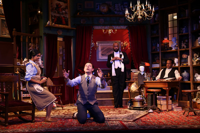 The plot of Candida revolves around a seeming competition for the heart of the title character (played here with a great sense of equanimity and twinkle-eyed amusement by Avanthika Srinivasan). The rivals for her heart are her husband, the affable if overworked and distracted Rev. James Morell (R. J. Foster); and a young, swooning poet named Eugene Marchbanks (Avery Whitted, a very funny physical comedian), who has attached himself to her like a reverential barnacle. Gingold's artistic director David Staller has relocated the play from late Victorian London to New York during the Roaring Twenties. Lest we miss the switch in locale, the revised opening scene is full of references to Hell's Kitchen, Greenwich Village, and the Lower East Side. The set design by Lindsay Genevieve Fuori, the main living space in the Morells' home in Harlem, is a marvelous collection of every manner of artwork, bric-a-brac, and random displays of tchotchkes that is a hoot to feast your eyes on while waiting for the play to begin. For some unexplained reason, the production is set in 1929, perhaps an oblique reference to the looming Great Depression, never addressed but which undoubtedly will soon come crashing down on the title character's blowhard capitalist father. Bringing in Candida's father, Mr. Burgess (David Ryan Smith), allows for Shaw to pit his strong socialist views and lifelong battle for social justice against his disdain for profit-obsessed capitalism. Certainly some of that debate occurs in this production as Burgess and his son-in-law lock horns, but the emphasis is decidedly on the domestic battle between Morell and Marchbanks, the erstwhile savior who wants to "rescue" Candida from a life of being a mere housewife. It is a lot of fun to watch the two go at it and to see Morell's cool confidence slowly melting away until the final scene when the pair demand that Candida choose between them, as if they ever had any say in the matter. Joining the others and contributing quite nicely to the general merriment are Peter Romano as Morell's curate Lexy, and Amber Reauchean Williams as his clerk Prossy, who has a crush on Morell and who has her own terrific moment of tipsy silliness. Throughout, the production plays up the comedic aspects of the play to a frothy romp and delivers an evening of joyful theatergoing. Candida