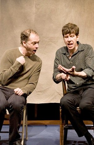 Playing over a dozen characters without even the benefit of costume changes, Jenkins and Stanton are demonstrating a knack for quick-flip versatility that challenges that of Cliff Saunders and Arnie Burton in The 39 Steps on Broadway. Under the frenetic but precise direction of Carl Forsman, they effortlessly slip into and out of an astonishing array of genders, ages, and ethnicities, without ever losing sight of the mechanics of their convoluted stardust story. As the personalities mount, and occasionally topple, you realize how endlessly resourceful each man is as both actor and comedian. And yes, Euripides is at the heart of it all. Or, rather, his seldom-performed play Ion, about a disastrous intermingling between the God Apollo, the Oracle at Delphi, a girl named Kreousa, and the baby that draws them all together, which somehow ends relatively happily. ("Maybe that's why it's never done," one character notes. "Nobody eats their children.") A struggling actor named Joel (Jenkins) is directing a modern adaptation, titled Love Child, at a tiny Red Hook performance space nestled behind a sausage restaurant, not knowing a big-time casting director in the audience wants him for a hot Hollywood TV series. Also in the audience are Joel's agent Kay and her ditzy friend Ethel, who by way of cell phone, hearing aid, and their general presence become at least as much a part of the show as Joel. Onstage, an oil slick makes entrances and exits treacherous, a grandstanding Latina diva can't wait to take her moment in the spotlight by any means necessary, and a visitor to Delphi Sanchez (the TV psychic character) passes out in the middle of a reading. There's also the small matter of Joel not knowing the truth about his parentage, and most of the other characters knowing much more than they're willing to tell. Chaos, perhaps predictably, ensues. It doesn't take long after the start of the performance-within-the-performance for both Love Childs to lapse into utter ridiculousness. That's also when you start to feel the wear and tear of a narrative that sometimes lumbers, rather than saunters, toward its destination. While events are supposed to rise to a certain Hellenistic level of improbability, the revelations leave you constantly wondering "What's next?" - and not in a good way. Jenkins and Stanton go overboard in stressing the importance of each of the branches of the bizarre family tree flooding the stage by the conclusion. They're much more successful at evoking love and affection for the greater theatrical family: the people onstage and off who are responsible for bringing even ramshackle shows like Joel's Love Child to life. Scenes in the actors' dressing room beautifully define each of the cast members, from the grizzled veteran on down. Kay and Ethel are a delightful look at audience members from hell and agents going through (and putting their clients through) hell, without ever losing sight of their inherent humanity. One brief bit even makes an addled stage manager a world-class laugh-getter. You won't particularly need to adore the theater to love Love Child, though it does presuppose some familiarity with backstage life and the content and structure of Greek tragedy that could baffle the uninitiated. Luckily, Jenkins and Stanton's rigidly disciplined clowning well help illuminate the piece's darkest obscurities. Even if the exact machinations of their characters are not always all they could be, they'll communicate everything you need to know through the international language of comedy. By the time the evening is through, don't be surprised if you feel fluent in that yourself.