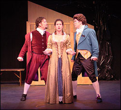 Unfortunately, the third side of the love triangle that comprises most of the story is slightly weaker. Brian Eric Stivale sings well as Brom Bones, Katrina's current lover and childhood friend. However, he seems slightly less an original character than the others; the presence of a comic sidekick (Lars, played by Ed Smit) and the style of his music (particularly "Who Needs Schoolin'?" in the first act) often make him appear to be an imitation of Gaston from Beauty and the Beast. Director John DeBlass has generally staged the material simply and effectively, keeping the story moving along swiftly. The biggest lag is near the end of the first act in the first of two chase scenes, which is over almost before you're sure it's begun. His choreographer, Maria Zannieri, stages a strong dance for the party near the end of the show, but some of her other moments - including the opening ballet and the dance in "Who Needs Schoolin'?" leave something to be desired. Deborah R. Rosen's sets and Paul Ziemer's lights are perfectly adequate, and Shana McKay Burns has provided some beautiful costumes. Though the musical is aimed squarely at family audiences, it is likely adults will enjoy the show more than children, due to the focus on the central love triangle. Scenes dealing with the Headless Horseman are generally few and far between and staged abstractly (though appropriately) when they do come about. DeBlass, Belviso, and Baum create some suspense, particularly near the end, but the show lacks the tension needed to ever be truly scary. Regardless, this adaptation of The Legend of Sleepy Hollow can be appreciated by audience members of any age for its interesting new take on Irving's story and its haunting, beautiful score. Photos: Deborah R. Rosen