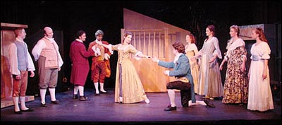 Perhaps one of the most striking images associated with Halloween is that of the Headless Horseman. The mysterious figure, an important character in Washington Irving's The Legend of Sleepy Hollow, is onstage again in the return engagement of Glass Slipper Theatricals' musical version of The Legend of Sleepy Hollow, now playing at the Wings Theatre. The musical, with a book by Meg Belviso, stays quite true to Irving's original tale of Ichabod Crane, the lovely Katrina with whom he becomes enamored, the more earthly man who stands in their way, and the unseen apparition haunting the nearby Sleepy Hollow. Belviso's adaptation is uncomplicated, with a fair amount of humor and period flavor. Unlike other adaptations of Irving's work, there are few hard and fast answers present here. The exact nature and meaning of a significant number of events are left to the audience to determine. The Company Even better than the book is the score, with Belviso's lyrics set to Eric Baum's music. There are over a dozen songs of a surprising amount of variety, generally crossing between the traditional Broadway-style show song and the more "post-modern" style that is a surprisingly appropriate choice for the subject matter. "A Town Like Ours," a gossip-fest in song, and "That's How Learning Starts," a contrapuntal song for Ichabod and his students, are particularly clever while Ichabod and Katrina's duets are ravishingly beautiful. Though of a couple of the songs last too long and dull their dramatic effectiveness, overall the score is very good.