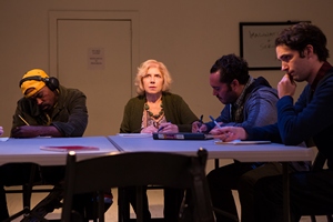 The inspirational quote seems straightforward enough, a way to get things going for the random collection of amateurs who have gathered for the class. But what they don't fully appreciate is that the road to creative imagination will take them through a lot of unsettling truths along the way. And not even the instructor, Seymour (Matt Harrington), will be immune. Much like Annie Baker's Circle Mirror Transformation, to which In The Room bears a striking resemblance, the play is composed of short scenes that take place over the period of several weeks. During that time, we slowly get to know each of the half dozen participants as they begin to let down their guard. In Baker's play, the setting was a suburban community center and the class was an acting workshop. Here the setting is a studio in New York where a production of Seymour's one successful play took place some years before. Teaching the workshop may help him find a way to return to his own writing. In The Room, deftly directed by Adam Knight, is well suited to the small space where it is being performed. The audience is seated in close proximity to the actors, and most of the action takes place around a pair of folding tables, where the characters participate in writing exercises and eventually begin to read aloud from their work-in-progress. As the participants open up, we feel we are privy to some very personal conversations. Seymour is quite diligent about protecting feelings, insisting that any comments about each other's writing be confined to encouragement and discussing what they like about it. As anyone who has shared a creative work understands, everyone is quite vulnerable, especially as they begin to reveal things about themselves. None of this is handled melodramatically; it's just the truth of it that will either shut them down or free them up. It also happens that at least some of the participants are not strangers to each other, which adds the weight of additional baggage to the proceedings. There are no grand revelations, but at least some of the characters emerge all the stronger for the experience. One of these is Scott (Jacob Perkins), barely out of his teens and seemingly the most clueless member of the group. It's not clear what he is looking for, and he does seem a misfit, but when he does emerge from his shell, it's quite an event. Also compelling is the growing friendship between Jessie (Robert Karma Robinson) and Clementine (Susan Neuffer), a much older woman who is empathetic, spirited, and thoroughly open to new experiences. We also learn some unsettling things about the relationship between Herman (Reuben Barsky) and Lydia (Chelsea Melone), and about Seymour and his one-time love Rainer (Suzy Jane Hunt), who has mixed motives for being part of the class. In the end, we feel we have been engaged with authentic characters. They may turn out to be ships that pass in the night, but all of them have been changed from their experience in the writing workshop.