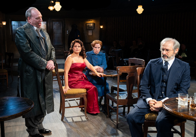 This is the central question to be considered while attending a performance of King of the Jews. The play, which was first produced in 2007, takes place in occupied Poland within the confines of the Astoria Café in Lodz. The actual historical café would soon become part of the Lodz Ghetto in which some 180,000 Jews would be confined within an area of four square kilometers, many to die of starvation or disease, with many more to be sent to die or barely survive in concentration camps. Out of sight of the audience, unspeakable horrors are unfolding. But more than a horror story, this is a play about ethics, morality, and the personal decisions that the characters must wrestle with while we are in their midst. Bargaining with the devil is not likely to lead to a happy conclusion. As we enter, we find ourselves in an immersive setting where the play will unfold all around us. We are invited to sit at one of the round tables spread around the room or on one of the wooden chairs along the perimeter of the performance space. All of the characters, save one, are Jews of various backgrounds and occupations. Two are rabbis, one is a comedian, another is a singer, another a doctor. A couple are members of the wait staff or cooks or musicians. Indeed, as we enter, two of these, identified as Jews by the yellow stars they are wearing on their clothing, are performing popular songs from the era on the café's small stage. All of their lives are about to be irrevocably changed. Ahead of locking the Jewish population of Lodz into what will be a walled-off and heavily guarded ghetto, the Nazis have enlisted the services of a local "Volksdeutscher" as their liaison, Wohltat (Daniel Oreskes, giving a devastating performance as a thoroughly corrupted man devoid of conscience). Wohltat, whose name, incidentally, translates as "good deed," intrudes in order to present the company with one of what will be several of the Nazis' "solutions to the Jewish problem." The denizens of the café will need to form a "Judenrat," a Jewish "Council of Elders" who will be in charge of making all of the internal decisions within the Jewish community. Their word will be law and absolute, a form of self-rule, self-government, and enforcement. Included among their decisions will be identifying which Jews will be subject to "special treatment." Suddenly, this disparate group is caught in an unfathomable dilemma. To refuse to participate will mean death. To agree will mean, what? Through their arguments and discussions, the play brings out the best and the worst in each of them. Might it be possible to outwit Wohltat and the Gestapo? Can bribes buy lives? Can many be spared, even at the cost of sacrificing some? Can you ever satisfy a hungry wolf? As an ensemble piece, carefully directed by Alexandra Aron to highlight the nuances, King of the Jews works extremely well in examining the moral ambiguity of those caught in a trap from which there can be no escape. While the novel on which the play is based focuses heavily on the central character of the doctor (here played by Richard Topol), who becomes the self-appointed, mentally unstable and self-justifying head of the Council, the play gives a voice to all of the characters, allowing for a rich thematic complexity. Perhaps none is more devastating than a young teenage boy (played by Wesley Tiso), whose silence during most of the evening speaks volumes, and whose voice, when he finds it, offers up a vision of hell that silences everyone else. The rest of the cast are equally excellent here as the members of the Judenrat: Rachel Botchan as a cabaret singer; David Deblinger as a comedian who makes jokes of the gallows humor type about der Fuhrer, referring to him by the code name of "Horowitz"; John Little as an elderly waiter who would willingly sacrifice his own life rather than identify others to be put to death; Allen Lewis Rickman and Robert Zukerman as two argumentative rabbis; JP Sarro as a cook and musician; Dave Shalansky as the proprietor of the café who meets an early and disturbing fate; Jonathan Spivey as a Hungarian furrier and musician who is unexpectedly trapped in Poland owing to the war; and Erica Spyres as a musician who makes a risky trade with Wohltat. King of the Jews deals with complicated socio-psychological (which is to say, human) issues. If it sometimes veers into the literary abstractions of an allegory or the darkest of satire, the historic truth that underpins it keeps it grounded in its inexorable reality, while the more recent global rise in antisemitism makes it a cautionary tale for our time. What would any of us do in these circumstances? A sobering thought, indeed.
