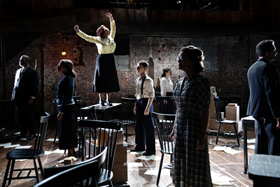 As anyone reading this is probably aware, the original production of Wholesale is best known for Barbra Streisand's star-making performance as the harried and big-worded secretary, Miss Marmelstein. In his New York Times review, Howard Taubman wrote, "The evening's find is Barbara [sic] Streisand, a girl with an oafish expression, a loud irascible voice and an arpeggiated laugh." In the most anticipated performance of the evening, Julia Lester steps into the role and more than holds her own. As Miss Marmelstein, she offers fresh interpretations of Harold Rome's songs, for which he wrote the music and lyrics. She wrings every bit of humor from Rome's iconic "Miss Marmelstein," and even more impressively, she leads a devastating ensemble song, "What Are They Doing to Us Now?" The song is a passionate and powerful lament about the unrelenting suffering caused by corrupt and remorseless rulers, and with its Jewish folk music intonations, the number is chilling and positively frightening, particularly in these dark and dangerous times. Adam Honoré's dramatic lighting makes the performance even more gripping by assailing the audience directly. Under Jacinth Greywoode's musical direction (and Greywoode also orchestrated for a six-member orchestra) and David Chase's adapted and arranged scoring, Rome's songs are lovingly presented. (Kudos also to Sun Hee Kil's sound design.) Many of them, such as "Momma, Momma," "The Family Way," and "A Gift Today" contain motifs from Jewish folk music and sung prayer ballads. Others, like "When Gemini Meets Capricorn" and "Have I Told You Lately," have their roots in Tin Pan Alley. Ellenore Scott's choreography, which uses elements of ballet, soft shoe, and jazz, keeps the sweeping narrative in near constant motion. Mark Wendland's scenic design consists primarily of work tables meticulously lined up within a cold and forbidding factory setting. The initial impression is reminiscent of the sewing tables in The Pajama Game, but the company moves and shifts them to create any number of New York City locales. (The New York skyline constructed of textile rudiments is a particularly nice touch.) Ann Hould-Ward's costumes and J. Jared Janas's hair, wigs, and makeup designs are period perfect, and if this were a larger production, it would have been fun to see what they could do with the first act's suspense-filled fashion show. (Cullman and the designers offer a clever way around the additional costs the scene would entail.) Later this week, audiences will have a chance to connect with another familiar cad, Joey Evans. One can only hope that the new version of Pal Joey is as exuberant, electrifyingly performed, and as profoundly provocative as CSC's I Can Get It for You Wholesale.