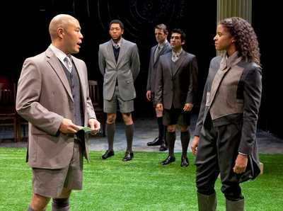 For even the audience is no barrier against the zaniness perpetrated by the King of Navarre (Hoon Lee), and his hangers-on Berowne (Nick Westrate), Longaville (Keith Eric Chappelle), and Dumaine (Jorge Chacon). More than once, someone runs into the house to escape being caught writing a love letter. The steps inside the theater are frequent perches from which someone else watches and comments on the action. And when it comes time for a raucous song, the actors are as likely to belt out their parts from the aisles as they are to dance about onstage. Coonrod's environmentalist sensibilities pay double dividends: They transform the audience into the ostensibly disapproving society the King and his charges hope to shun, and they reinforce the controlling notion here that romance is inescapable. It should be noted, however, that neither the King and his men nor the Princess of France (Renee Elise Goldsberry) and her attendants, Rosaline (Rebecca Brooksher), Maria (Samira Wiley), and Katharine (Michelle Beck) have any less fun when they're planted in the center of designer John Conklin's courtyard set. For them, love is always a game, and one well worth playing. But the ebullience of the cast and the no-boundaries staging cannot keep the good times rolling continuously for over two intermissionless hours, as is required. Eventually you find yourself craving consistency and depth, and neither is on spotlit display. Coonrod injects a variety of references to modern entertainment forms, from fragments of hip-hop dancing or the 1812 Overture, and they keep the action unpredictable, but they also rob the production of any concrete sense of time or place. Oana Botez Ban's costumes suggest something akin to recent memorythough the men wear short pants a surprising amount of the timewithout ever fully transporting you. That ultimate journey is crucial. Though this is one of Shakespeare's lighter entertainments, it demands enough concentrated thought to establish a balance between the fluffy fun and the melancholy finale that reminds you of how infrequently first-chased love works out long-term. Coonrod keeps deploying her tricks, but is always lopsided in one way or the other; usually it's erring on the side of comedy, as with the subplots concerning the Spanish knight Don Adriano (Reg E. Cathay), his page Moth (also Wiley), and the country girl named Jaquenetta (Stephanie DiMaggio) whom the Don wants to win from the fool Costard (Mousa Kraish). But when the serious stuff hits toward the end, it's difficult to process because of the lack of weight and heat in the gender battles you witness leading up to it. By the final scenes, when the men start dressing as Russians and the women parade about in masks in order to test their paramours' true feelings, you start feeling as lost as the sexually frustrated folks you're watching. The actors, particularly Lee, Goldsberry, Westrate, and Brooksher, are not at faultthey do impressive work at leaking and suppressing their characters' ardor, and keeping these people on a single unbroken emotional track. Steven Skybell and Francis Jue, as a schoolmaster and curate conducting their own investigations into infatuation, may appear to be in a different play entirely (an in a theater with considerably higher ceilings) but also maintain the necessary sense of forward locomotion. More often than not, Coonrod seems to moving in circles, if for no other reason than that circles are funny. Certainly she has no trouble producing the laughs, but she doesn't give you much else to take away from the experience. At its best, Love's Labour's Lost teases the heart and the mind equally. Unfortunately, Coonrod keeps you too focused on how they contrast so you never quite believe thatfor excitable young people, at leastthere doesn't need to be any difference between the two.