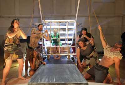 Also, it is set in the distant future in a place formerly known as New York Cityso far in the future that the entire work is presented in a language that time and circumstance have pushed along a linguistic path leading far away from English as we now know it. Since I am not conversant with that language, what the rest of this review will consist of is one person's interpretation of the show. Enter the theater and you will find yourself greeted with enthusiasm by members of "the pack," as they are referred to in the program. They are really glad to see you, and may escort you to a seat, or playfully nudge you, or offer you a raisin or a piece of a Twizzler. They seem so playful, in fact, you may wonder if you have wandered into a clearing that is home to a group of friendly and curious monkeys. As it happens, several of the characters are, indeed, identified as monkeys, but the rest have names that come straight out of Rudyard Kipling's "Jungle Book," not an affectation, but a bit of iconic mythos that has survived from the past. Sort of like the video of Hello, Dolly! that represents time long gone to the title character in the movie Wall-E. As the play itself begins to take shape, you gradually start to sense the purpose of your visit, and why it is the players are so glad to see you. You also come to understand that not everyone you encounter will be friendly. Indeed, you are there to bear witness to the story they have to tell, a cautionary tale about love and loss in a time of war. Might this be our own future they are warning us about? Through actions, gestures, song, dance (choreographed by Ben Hobbs), and the occasional use of words that have roots in English (a lullaby sung to an infant, for example, contains the lyrics "La La La Ba"), the cast delivers its tale. And, yes, it asks an audience to pay attention to all of these modes of communication, but the effort pays off as you get to recognize the characters as individuals and understand the various relationships among them. Some are kind and gentle; others are mean and dangerous. Some fit in well with the community; others are misfits. Some are brave; others are timid and vulnerable. In short, they are just like us. Byuioo is not the first show to incorporate a made-up language. The musical The Blue Flower, by Jim Bauer and Ruth Bauer, required Marc Kudisch to perform a large chunk of dialog in a language his character called "Maxperanto." But most of that show and all of the songs were performed in English. So it's hats off to Nate Weida, the writer and composer (who also does a splendid job directing the band), for having the courage to explore this direction to it's fullest while telling such an engaging story. It is clear that the director, Andrew Neisler, and the excellent cast have worked hard to bring Mr. Weida's vision to life. It cannot have been easy to adapt to using an invented language and to make it so fluent and natural. The performers reminded me of the cast of Hair (or "the tribe," as they were collectively referred to), and so, rather than single anyone out for specific praise, I'd like to recognize them all: Andrew R. Butler, Jessica Frey, Stephanie Hsu, Sydney Matthews, Molly McAdoo, Carly Menkin, Ben Otto, Ronald Peet, Cyndi Perczek, Arielle Siegel, Nicole Spiezio, Dan Tracy, Rocky Vega, Israel Viñas, and Eric Williams. Wish I knew their word for "Bravo!"