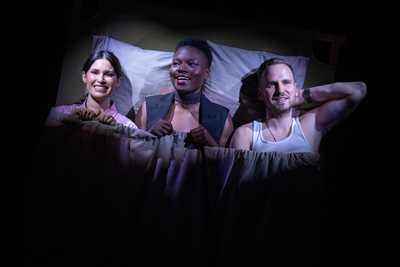 The wackadoodle atmosphere begins with the setting, a Navy base on an island near an enemy state. Rachel Hauck's abstract set is dominated by what appears to be a backdrop of an overhead shot of the base, with rooftops or tents, some dislodged, that occasionally light up. We know right away to take nothing literally, with the entrance of a narrator-angel (Shaunette Renée Wilson) claiming to hail from Angels in America. This angel, though, is less lofty than Tony Kushner's. She's jokey and raunchy, and the jocularity continues with the other characters' names: The Memnon family, headed by General Aga (David Ryan Smith), abetted by his sex-starved Wife (Cindy Cheung), son Private Willy (Ryan Spahn), and Willy's wife Sapph (Nicole Villamil). The only doctor on the base is a psychiatrist, Jess O'Nope (Marinda Anderson), and the object of most of the other six's affections is Lt. Shane Horne (Esco Jouléy), a major piece of work. Horne, perpetually chasing what she calls "the merries," is a rabidly oversexed lesbian with much-commented-on "massive biceps" (Jouléy identifies as nonbinary). Horne is just out of solitary for diddling the general's wife, and over Merry Me's 90 minutes she also seduces the doctor, the younger Mrs. Memnon, and two lady prison guards we never meet. It's so rare to see a happy, libidinous lesbian onstage, and Jouléy practically kicks their heels up in glee. What a peculiar island this is, and how many idiosyncrasies Jung invests in it. There's been a power failure plaguing it for months, though the vibrators still work. Private Willy is charged with restoring electricity, while he's gamely attempting wokeness (and good sex) with his wife, though Jung eventually unleashes a good deal of straight-white-cis-male invective (see below). Since the phones don't work, residents make do with empty paper cups and string. Restoration comedy tropes spring up: characters in cross-dressing disguises, elaborate deceptions with comical consequences, bawdy double entendres. It's chaotic. And funny. Jung's main point, if there is one, is to celebrate sex and sexuality. But she also tackles the Big Issues, as here, where the angel has charged O'Nope with a divine mission: O'NOPE: The heavenly angels have chosen a female psychiatrist to kill off half of humanity with an ax?