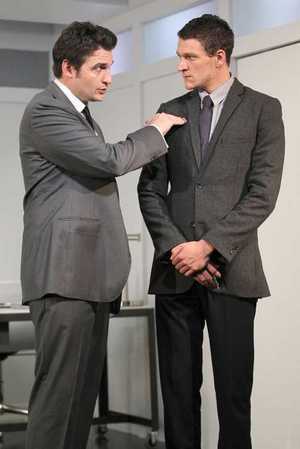 Jason unites them all, threading through every scene his messed-up psyche and self-defeating methods of dealing with loss. But Ebert goes well beyond the script's precepts, finding the darkness and the playfulness within this man who's lost his own reason to live. He doesn't reveal all (or even most) of this right away: He starts standing tall and straight and crisply dressed (in one of costume designer Jessica Wegener Shay's many stylish suits), and progresses to slumped shoulders and slob-casual attire; but there's no gimmickry about his transformation. Hinderaker tells you so much about who Jason is, and Ebert portrays him so honestly and starkly, that you believe every bit of it. Suicide, Incorporated is awash in such details, but to divulge too many more would be to dilute their impact as they make themselves known in the course of expanding this "familiar" story well past the boundaries of the theater's walls. Like the other excellent Roundabout production upstairs, Sons of the Prophet (by Stephen Karam, whose Speech & Debate inaugurated Roundabout Underground four years ago), this play is gorgeous and unsettling, a powerful depiction of how humanity's misplaced emotions can suppress its vital spiritand how coming to terms with that can help dispel the grief and strife that are capable of ending our lives before their time.