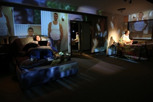 What Weiner nails are the feelings that drive the Samantha-Layne relationship. She expertly carves the women from raw loneliness, and lets you see how their online façades alternately reinforce or weaken their natural states of being. Her cunning metaphors for a crushing normalcy are morning broadcasts of The Price Is Right for Samantha and mind-numbing office politics for Layneneither extreme is fulfilling, and happiness will ultimately only be found away from both. The pair's halting initial conversations togetherSamantha mocking in part, Layne as desperate as she is hopefulgive way gently to a more open acceptance of each other and themselves. (Each of these is staged with the performers speaking their lines while accompanied by Darrel Maloney's fast-moving projections of the heavily chat speak onto the walls of Arnulfo Maldonado's properly oppressive Nevada living room set.) The women's e-consummation is alarmingly tender, even absorbing, because, even though we know the impossibility of their union succeeding, we want it to anyway. (The haunting sound that accompanies it, by Thom Weaver, is wonderful.) Weiner has utterly convinced us that these two need that sense of completion just that much. And their difficulties, one of which begins at the end of that same session, and another that comes later as the truth gets harder and harder to hide, are agonizing because of the weight we've learned that even the tiniest interactions carry for Samantha and Layne. Little else about the play or this mounting of it is as interesting, though. The plot, perhaps egged on by Weiner luxuriating too much in the pulpy movies her heroines love (their joint favorite is the Rob Reiner-Aaron Sorkin politi-schmaltz fest, The American President), becomes increasingly improbable as it gets more complicated, with the events and attitudes that fill the last few scenes stretching credulity well past the snapping point. And Delores and Suz (and, to a lesser extent, Dom) are drawn broadly and irritatingly; if this was to prove why Samantha and Layne so need escape, mission accomplished, but even so, the characters are unlikable almost to the point of being unwatchable. Even most of the actors are commenting on their roles rather than living inside them. Santiago and Styles have crafted full caricatures, and play them to the hilt, to no discernible emotional effect. And though Layne is written as a bottomless well of tamped-down pain, Finn's portrayal of her is more loud and scattered than anything else: She deploys a lot of shrieks and bulging eyes, when playing things down, as she does to superlative effect at the end, would be far more effective throughout. Only Herlihy and Hernandez get everything right: she because she projects the totality of Samantha's hollowed-out heart and soul without ever degrading into self-pity, he because he, similarly, blends Dom's white-knight and avenging-angel inclinations into a single person believably capable of winning these two broken women's hearts. Their performances, in other words, are complex, just like Kingdom Come at its best. Each of us is like that, after all, brave in some ways, afraid in others, and in search of some method of equalizing their effects. The Internet appears to many to do that, but is just one more trap, inviting us to experience and inflict hurt. Healing from the inside out may be challenging, but it's the only thing that always works. Samantha and Layne may be in a downward spiral, but they're not irretrievablethey just need each other to provide the balance that's been denied them elsewhere. In its isolated gorgeous moments, Weiner's play shows us why it's so important to be our best, most naked selves when that hand comes reaching to help us back up and back to life.