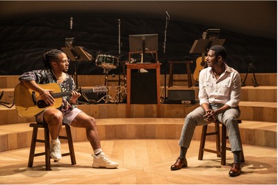 Arnulfo Maldonado's attractive set, for no discernible reason, is arena-style, a descending curved staircase framed by a mountain backdrop and mirrors on the side, expanding the already wide stage. On it, Jean (Billy Eugene Jones) just starts narrating at us, unspooling a life tale that comes across as a series of short stories. He was, it seems, a Haitian French teacher who'd obtained a visa to the U.S., where he intended to go to community college and continue his teaching career. His life took some unexpected turns, including mostly contented relationships with at least the three girlfriends we hear about. But his story is revealed very gradually, because we're also hearing the monologues of ... Jonah (Chris Myers), the Haitian-American immigrant living in a later era than Jean's, who, we ultimately learn, is Jean's son. He's gay and he has a thing for, as he relates to us, redheads and daddies. Smart, confident, but subjected to homophobic taunts from an early age, he has also crossed the Caribbean to find a better life in the States. Which he largely does. At a time of so many immigrant-experience plays, most of them about how miserable the immigrant experience is, here's the rare one where the huddled masses yearning to breathe free are actually pretty fortunate, and pretty happy. It's a nice change. But it's not the basis for searing drama. Instead, it's a somewhat random dual narrative, punctuated by the occasional pungent observation on American life. Jean, on Thanksgiving: "This strange American holiday ... a day of giving thanks. Every day is that day in Haiti. Americans like to schedule, schedule every experience of their lives." But wait, there's more: a band, the Bengsons, with Abigail and Shaun Bengson interrupting the narrative with their folk songs. They're pleasant listening, and they give both Jones and Myers a chance to shake a leg, to Steph Paul's choreography, when dance works its way into Jean's and Jonah's reminiscences. But the songs' relationship to these characters' existences? Tenuous, at best. We like these guys: Jones has a lovely lilting accent that makes Jean's memories sound more mellifluous than they read on page, and Myers has a varied, surprising delivery that can earn a laugh out of a line that doesn't really deserve it. But Augustin tends to repeat himself a lot, and there's only so much tension to be wrung out of these two narratives, each pushing forward without much conflict, and nearly devoid of strong emotion. Both men largely enjoy their American lives; both, after several false starts, are lucky in love; and we're left wondering if these two stories will ever coalesce, if father and son will ever come to any kind of rapprochement. (They don't hate each other, they're just mutually tentative and uncertain; again, not the stuff of sizzling theater.) Which, not much of a spoiler alert, they will. By the time Jean and Jonah are both grooving to "Oh My Love," with Myers plucking his own guitar, we're touched. It's the usual classy MTC production, with glowing lighting by Stacey Derosier, unobtrusive costumes by Dominique Fawn Hill, and direction by Joshua Kahan Brody that stirs up as much emotion as can be gotten out of two benign life stories where nothing all that gripping happens. I expect that Augustin, a Haitian-American immigrant with an impressive resume (including episodes of the excellent Apple TV+ "The Morning Show," invested a lot of love in this recounting of his homeland and the price, and rewards, of assimilation after one has departed from it. But with its low-key retelling of two unremarkable lives, and its haphazard monologue-song-monologue format, Where the Mountain Meets the Sea–a title, by the way, that's never explained–resolutely fails to stick to the bones. Where the Mountain Meets the Sea