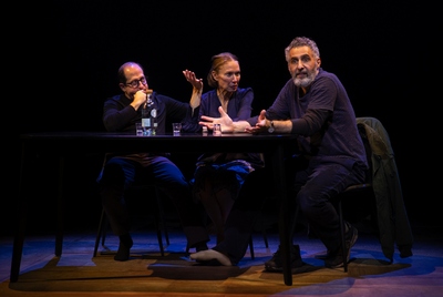 Sabbath is also a product of the theatre. He is a former director and worked for many years as a puppeteer. When arthritis crippled his fingers, he turned to teaching. A phone-sex scandal with one of his women students led to his dismissal from the academy. He also has a penchant for prostitutes, and he has been married twice. His first wife, Nikki (Elizabeth Marvel, who plays all of the women in Sabbath's narrative), is an actress who mysteriously disappeared. His second wife, Roseanna, is a recovering alcoholic and the two have a tempestuous marriage. The love of Sabbath's erotic life is Drenka, who runs a country inn with her husband Matijia (Jason Kravits, who plays all of the other male characters). Even after her death from cancer, Sabbath still receives sexual gratification (including at her grave) from her memory. The ghosts and demons of Sabbath's past continue to torment him, and he believes his mother's specter has urged him to suicide. But even as he is wracked with memories of his dead brother, who was killed in World War II, Sabbath is not above flirting with his old friend's wife and stealing a pair of panties belonging to the man's daughter. Having read most of Roth's novels, I am impressed with the ways in which Levy and Turturro capture the writer's spirit. They have distilled the book to its essence. This, however, has both positive and adverse effects. The adaptation captures the titillating and shocking elements of the plot, and there is a great deal of humor mined from the original. Yet, even though the script is composed of Roth's own words throughout, the extended ruminations and thick descriptions are (as they must be) lost. Debatably, this is one of the reasons I suspect Roth's novels (except in a few cases) have resisted successful film versions. A condensed version of a Roth novel does not do full justice to the genius behind the work. Sometimes I felt as if watching a dramatized Cliffs Notes. Still, with direction by Jo Bonney, the performances are uniformly excellent. Turturro gives a fearless, no-holds-barred performance. While he may get physically naked, that is nothing compared to the emotional layers he peels off in the course of the performance. Sabbath is a complex and not altogether likeable man, and Turturro does not sentimentalize the character. Marvel is, as always, outstanding. She is especially moving as Drenka, who is imperious and complicated, but also deeply compelling. In one of the final scenes, Marvel ultimately makes the Croatian innkeeper haunting and sympathetic. In several less showy roles, Kravits does excellent work as well, particularly as Norman, who doesn't bat an eye when Sabbath mistakenly plays footsies with him instead of Norman's wife. The production benefits from a streamlined design. Making use of a few pieces of furniture, striking lighting, and numerous projections, the play captures the sweeping shifts through place and time in Sabbath's memory. (Arnulfo Maldonado designed the sets and costumes, Jeff Croiter the lighting, Mikaal Sulaiman the sound, Alex Basco Koch the projections, and Erik Sanko created often hilarious shadow puppetry.) To the credit of the adapters and designers, there is a good deal of theatricality in this excursion into Roth's world. Nevertheless, there's a certain amount of irony in the notion that Sabbath's Theater may be best suited to the page and not the stage.