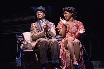 It would be one thing if we could say this version of Pal Joey is an altogether "puzzling" mess. But it isn't. In fact, against all odds, it is highly engaging and entertaining, thanks in large part to a wonderful, talented cast and a plethora of Rodgers and Hart songs that have been pulled not only from Pal Joey (of which only a few have survived the cut), but also from others of their shows, including The Boys from Syracuse and Babes in Arms. Surprisingly, these all work because most of them are self-contained diegetic numbers, sung as part of a club act or on the radio or at a recording session. They don't have to drive or comment on the characters or the plot, nor does it matter. They are all quite interesting, even exciting to experience here, especially as arranged and orchestrated by Daryl Waters for the small but gifted band, with special laurels to be bestowed on trumpet player Alphonso Horne. Kudos, too, to Aisha Jackson as Linda English, Joey's one true love interest (other than himself), who outshines the title character (Ephraim Sykes, playing to the hilt the perfect combination of superficial charm and overinflated self-importance) in every way; Jackson's performances of a half dozen classic tunes show her to be a perfect candidate to put out an album of Rodgers and Hart songs. Among the rest of the cast, you'll find excellent performances in great abundance. Elizabeth Stanley is first-rate as Vera Simpson ("Bewitched, Bothered, and Bewildered"), more complicated and savvy than you might expect; she is Joey's equal in terms of manipulating others while striving to shape him in her image so that she can remain in control of their interracial relationship, one of two in the production. Both of these relationships (the other is between club owner Lucille Wallace, played by Loretta Devine, and her beau Tony, played by Jeb Brown) become significant parts of the narrative in the new book by Richard LaGravenese and Daniel "Koa" Beaty. Devine is especially delightful as Lucille, the owner of the nightclub where Joey gets his first big break before he is almost crushed by Vera's efforts to turn him into "Bing Crosby dipped in fudge," as Lucille describes it. Also on hand and in glorious form is Brooks Ashmanskas, doing a very funny turn as a newspaper columnist who performs an unexpected version of one of the show's songs. All of this is to the good. However, even the elements of that mixed-up puzzle are very interesting. Call it a clash among creative teammates, each of whom has a different idea of how to proceed. But instead of compromising on a single vision, they have all gone full out in putting on the version of Pal Joey each of them envisions, resulting in that cat/poppies/village square/waterfall image. To begin with, to call the production Pal Joey is misleading, since the new product bears only a passing resemblance to the 1940 Rodgers and Hart musical, which was notoriously encumbered by John O'Hara's messy book. Where the original Joey was a white man trying to maneuver his way to success within a white world, Joey is now a Black man who is certain he can use his wiles, good looks, and superficial charm to break through the racial and racist barriers that have been keeping him in check. His relationships with the women in his life (Linda, Lucille, and Vera) take on all sorts of new meanings, especially since all three women can see right through him and succumb to his charms because they choose to do so. Then there is the co-direction by Tony Goldwyn and Savion Glover, which jumps around between straightforward narrative and more abstract interpretations, especially as evidenced via Glover's always thrilling if sometimes confusing choreography. Glover, who epitomizes the richness of the modern tap dance movement, has come up with an embarrassment of riches here, with his choreography embracing both traditional and syncopated, percussive tap styles, as well as dance in the mode of Alvin Ailey and even of the type of "exotic" chorus line movement that one might associate with a Josephine Baker revue. Most abstractly, an ensemble of dancers, generally seen in very low lighting, perform as "griots," connecting Joey to whatever is left of his soul that he hasn't bartered away, and to his spiritual and racial roots. That the presence of the griots is given a short explanation by Lucille near the end of the show suggests the creative team understands their ghostly presence needs an explanation. And, finally, given the total reshaping of the show, which includes references to Charlie Parker, Dizzy Gillespie, Thelonious Monk, Count Basie, Adelaide Hall, Ella Fitzgerald, Billie Holiday, and other great Black singers and musicians, one wonders what we're doing with an entire score composed by a pair of white musical theatre tunesmiths. Nevertheless, and having said all this, the overall show is a brilliantly conceived and gutsy approach to a 1940 musical that has never been given a truly successful production, at least not on Broadway. The creative team gets props and a huge round of applause for having the courage of their convictions. Honestly, with some rejiggering, this version of Pal Joey, which is almost too big to contain on the City Center stage, could find success on Broadway. For all its flaws, this is a thrilling venture. And honestly, wouldn't a cat/poppies/village square/waterfall picture puzzle be more interesting than any of these alone?