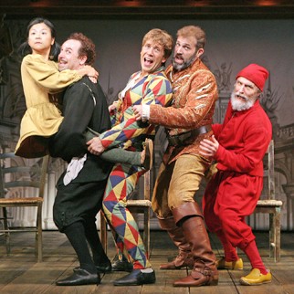 This adaptation of Francine Prose's 1974 novel sets out to chart the history of the Italian performing tradition of commedia dell'arte through the eyes of the group that "founded" and popularized it, The Glorious Ones of the title, as well as document how to theatre changed from an actors' to a writers' medium. One can see how this subject would hold enough appeal for playwrights and music-makers, who would likely cherish the idea of an all-bouncy, all-laughy trip through some of the nimblest and most colorful theatre in history. That it was molded into the delightful, and extremely long-running, Jones & Schmidt musical The Fantasticks suggests it's not an inherently bad idea. As realized here, however, the commedia must be coming tomorrow because it's all tragedia tonight. Ahrens hasn't illuminated anything about the characters and shtick that comprised the form, only inflated their one-note personalities to explosive extremes that spoil the central joke that the likes of Pantalone (David Patrick Kelly), Dottore (John Kassir), mischievous servant Francesco (Jeremy Webb), and the rest are the same offstage as on, and thus only need to live to be funny. But there's nothing whatsoever amusing about their lives or their interactions, which play up the on-the-edge existence of on-the-fringe performers in the 16th century with the sound and fury of a William Inge flop. Nor do their diegetic entertainments, or scenarios, do more than stroke the boundaries set forth over 500 years ago. Fart gags, swearing, and over-the-top histrionics remain a part of our culture (whole sections of the film industry depend on it), but here suggest only dusty obligation to antiquated ideas, not unbridled artistic freedom. (The sets by Dan Ostling and costumes by Mara Blumenfeld are likewise uninspired.)