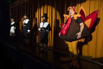 When that curtain parted, it made me nervous. It revealed a schoolroom set, Wilson Chin's, very like the one Amy Rubin did for Miles for Mary in the same theater last season, a comedy everybody else loved and I hated. Look closely, though, and you'll see some odd touches. It's a drama classroom, and there are posters for past productions at this high school, including Extremities, Angels in America, and Frankie and Johnny in the Clair de Lune. The mind boggles. Clearly an ambitious presence is behind these efforts, and that's Logan (Jennifer Bareilles), the director of the upcoming Thanksgiving play. She's New Agey, vegan, a failed actress who refocused on educational theater, seeing it as a way to expand minds, redress wrongs, and, not least, win acclaim for herself. Aided by her equally earnest boyfriend, Jaxton (Greg Keller), a barefoot, yoga-dependent street performer with acting aspirations that clearly won't be realized, she aims to present a Thanksgiving play that will tear down the white-guy constructs that endured for centuries and willfully misrepresented the Native American view. It's the right thing to do. Plus, the show's being partially funded by a Native American Heritage Month Awareness Through Art grant. (And a bunch of others FastHorse's grant names are hilarious.) That means engaging an Indigenous actor, so Logan hires Alicia (Margo Seibert), whom she saw in a head shot in braids and a turquoise necklace. She's from L.A., she's expensive, and, it turns out, she's not Native American, just able to play multiple ethnicities. Bam, the grant money is threatened. Then there's Caden (Jeffrey Bean), the fourth member of the troupe, an elementary school history teacher who dreams of being a playwright and isn't real patient with other viewpoints. Four very distinct personalities: all-business-but-insecure Logan, politically-correct-to-a-fault Jaxton, history-loving Caden, and Alicia, a sexy dumb blonde who distracts both the guys. Sexy dumb blondes are nothing new, but what Seibert does is fresh: She emphasizes how Alicia gets past the pretensions and overthinking of the characters around her, and makes stupidity appealing. Think Marilyn Monroe in Some Like It Hot. And Seibert has similar comic instincts. So, how do four white folks of varying backgrounds, concerns, and obsessions tell the story MGM told badly in Plymouth Adventure, in a way that respects and includes all relevant cultures, doesn't toy with facts, appeals to kids, and doesn't piss off parents? That's FastHorse's comic landscape, and it's richer than you can imagine. First, she knows how to lay the groundwork to set off fireworks: Logan's funding worries, her sometimes-shaky vibe with Jaxton, their verbal commitment to each other vs. their need to self-validate, Alicia's vacant yet somehow profound observations, Caden's insistence on historical accuracy vs. his appetite for the spotlight vs. his ogling of Alicia. Second, she knows how to set up a joke. (Alicia: "Oh, you're a couple. I did not get that." Logan: "Jaxton and I share a mutually respectful relationship." Alicia: "So you're not a couple?") They all want to do the correct thing, but what the correct thing is in these days of so many subcultures vying for attention on so many forms of social media is complicated. The four stumble through some improvisations, rewrite Caden's stiff dialog, debate the validity of colorblind casting, and arrive at a solution that's as satisfying to them as it is ridiculous to us. Interspersed are sequences of actual Thanksgiving drama efforts from different perspectives around the country, which FastHorse grabbed off Pinterest, like the "Twelve Days" prologue, as specious as they are well-intentioned. It's a nimble production, directed by Moritz von Stuelpnagel with the same comic verve he exhibited in Hand to God, and acted by a quartet that are in exquisite sync. If Bareilles could perhaps mine more self-doubt out of Logan, and if Keller's rasp is sometimes hard to hear (did he have a cold?), everybody knows when to be the focus of attention and when to back off. Tilly Grimes's costumes are just right for this bunch (she also designed some eye-catching puppets), and Isabella Boyd's harsh lighting rekindles some of our worst memories of high school. FastHorse, who has a Lakota father and a Norwegian mom and whose program note and interview handout in the lobby are both worth reading, raises tough questions even as she keeps us laughing. Who deserves a voice? When we appropriate and reinterpret others' perspectives, are we being fair? How objective are historians, and what are their sub-motives? Is political correctness a positive force? Happy Thanksgiving, everybody.