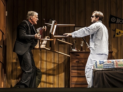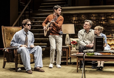 Sticks and Bones won the Tony Award for Best Play after transferring to Broadway, and it's easy to see why it was embraced by a country in the midst of a difficult-to-understand and even-harder-to-endure war that was forced to seriously face these issues nakedly. But separated from both that zeitgeist and the Nuclear Family aesthetic the Nelsons represented, the play has to work much harder to land, and every element must be precisely in style and in sync. That's where Scott Elliott's production falters and fails. Though Derek McLane has designed an appropriately kitschy set to function as the backdrop, everything else about the tone and execution is wrong. If Elliott understands where the play is supposed to start, and how it needs to be slowly but surely corrupted as it unfolds, almost no hint of that exists onstage. Neither the before nor the after is tangibly recognizable, let alone tangibly different, which makes the journey from naïveté to disillusionment unconvincing at best and untethered at worst. Bill Pullman disintegrates beautifully as Ozzie, as he's faced with the destruction of his own little corner of perfection, but even in the sharpest scenes he seems to be straining to hold his persona together, and he's much less successful at depicting the ultra-wise father who hasn't yet discovered everything he doesn't know. As Harriet, Holly Hunter is chilly and robotic, and there's nothing believable about her efforts to maintain a Stepford Wives façade when confronting the breakdown of society. The opposite problem afflicts Raviv Ullman: He's superb at finding the boyish brightness of Rick, but has a poor handle on letting the dark bleed through. Ben Schnetzer is one-note anger and screaming as David, the one character who needs to be rich. At least Nadia Gan makes the haunting most of her largely wordless role as David's Vietnamese heart-grabber. The overall most successful performance comes from Richard Chamberlain, who plays the family's priest. Chamberlain presents, as no one quite does, a curdling vision of old ways unable (or unwilling) to yield, but growing in intensity as the opposition mounts. His early-first-act scene, which sets the one-dimensional stage for the battle to come, and especially his violent second-act tête-à-tête with a past-caring David, are the only times you feel Rabe's heat pulsing from the stage. These moments show that Sticks and Bones can, on some level, still work, as questions of the role of religion and personal responsibility in society have been at the forefront of American discourse more during the last few years than at any other point in recent memory. But with the Nelsons all but forgotten, those messages can't pierce through the last several decades, let alone our hearts, unless they're delivered with far more detail, cunning, and care than Elliott and his team manage here.