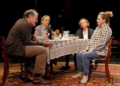 We today know that this refers to the forecasted Nor'easter, which is slated to bring frigid wind and rain to a region still reeling from the effects of Hurricane Sandy, and appreciate it on the level of an inconvenience that could swell to something more arriving on the heels of a tragedy. For Nelson's characters, it symbolizes as well an uncertain new existence that will have ramifications no one can quite predict. Most tantalizing yet, those of us in Tuesday's audiences were united with those characters by a third level of significance to that statement: what happens to the United States once either Barack Obama or Mitt Romney has won the presidential election. Sorry is, of course, the third play in Nelson's ongoing saga of the Apple family. Set on the morning of election day 2012, it follows on the heels of That Hopey Changey Thing (occurring against the 2010 midterm election) and Sweet and Sad (the tenth anniversary of the September 11 terrorist attacks) in examining how the inner and outer worlds of this group congregating in Rhinebeck, New York, collide and hopefully show how the bonds of kin and country are more substantial and more meaningful than most of us might believe. And for Nelson, who has also directed with a captivating sensitivity, this is the most successful attempt yet at perfecting the human half of the formula. This time around, the Apples are dealing with an especially profound personal event. Elderly Uncle Benjamin (Jon DeVries) has never fully recovered from his heart attack of two years ago and the dementia it brought on, and has become in recent months an unusual and unsettling burden on his primary caretaker, his niece Barbara (Maryann Plunkett). Marian and Jane (Laila Robins and J. Smith-Cameron), Barbara's sisters, have decided that Benjamin's behavior has become so erratic that he must be professionally cared for, and todaythe same day that the women's brother Richard (Jay O. Sanders) returns from a lengthy trip to Londonwill be Benjamin's first in a new assisted living facility. For about two hours, starting at 5:00 AM, the Apples angst about what this means and what its impact will be, and in doing so face up to their own decisions with regards to how they've lived, parented (or been parented), and, yes, voted. Discussions about the pain of doing the "right thing," the remorse inherent in making any tough choice, and the questionable aftermath naturally evolve into doubts about Obama's first term and whether he deserves a secondand whether his promises to America amount to nothing more than the same kind of empty ones the members of this ordinary family have so often made to each other.