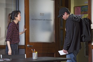 The play begins with a frank and worried discussion among three university creative writing instructors, who have in common a troubled and troublesome student, Dennis (Ki Hong Lee), an Asian American college junior. Silent, skulking, and arrayed in a baseball cap and sunglasses, Dennis is a scary presence, and his writing is cause for even greater alarm. Genevieve (Adeola Role) had the student in an Introduction to Poetry class the previous year, and his work was filled with violent imagery about rape and bleeding eye sockets. She tried to have him removed from the class, or at the very least sent to counseling, but to no avail. The school administration denied the requests, stating that the student had posed no active threat, and as an adult, he would have to commit himself to counseling. David (Greg Keller), the unsympathetic screenwriting instructor, taught him the following semester, and he had a similar experience. Judging from Dennis's demeanor and the scenes of torture, rape, and pedophilia in the student's scripts, David concludes that the kid is "a classic shooter." Now he's Gina's (Sue Jean Kim) problem. Dennis is currently in her creative writing workshop, and Greg and Genevieve implore her to reach out to the student. After all, they imply that as an Asian American woman, Gina might have better luck connecting with the student and getting him the help he needs. Most of the play that follows takes place during Gina's office hour as she attempts to draw Dennis out of his shell and determine whether or not he intends to bring harm to himself or others. I will avoid spoilers about the meeting itself and the play's (disappointingly, rather pat) conclusion, but audience members are warned in advance about the use of loud gunfire in the play. Perhaps, though, it is employed not in the ways one might expect.